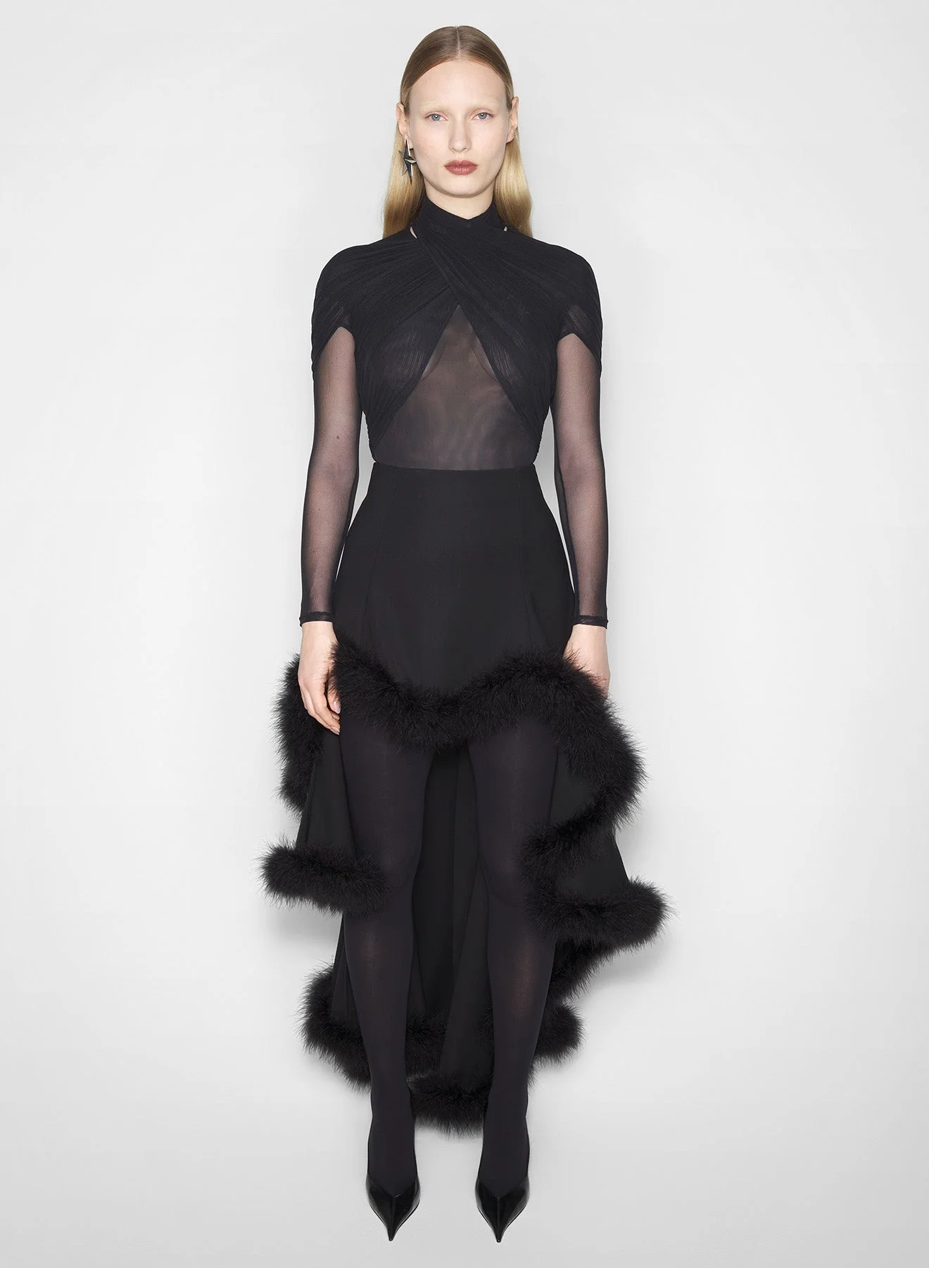 - waterfall skirt in wool twill - cascading hem with handstitched marabou feather trim - Invisible zipper in the back DETAILS MAIN FABRIC:78% VISCOSE 22% VIRGIN WOOL made in BULGARIA style: 25F1JU0575196