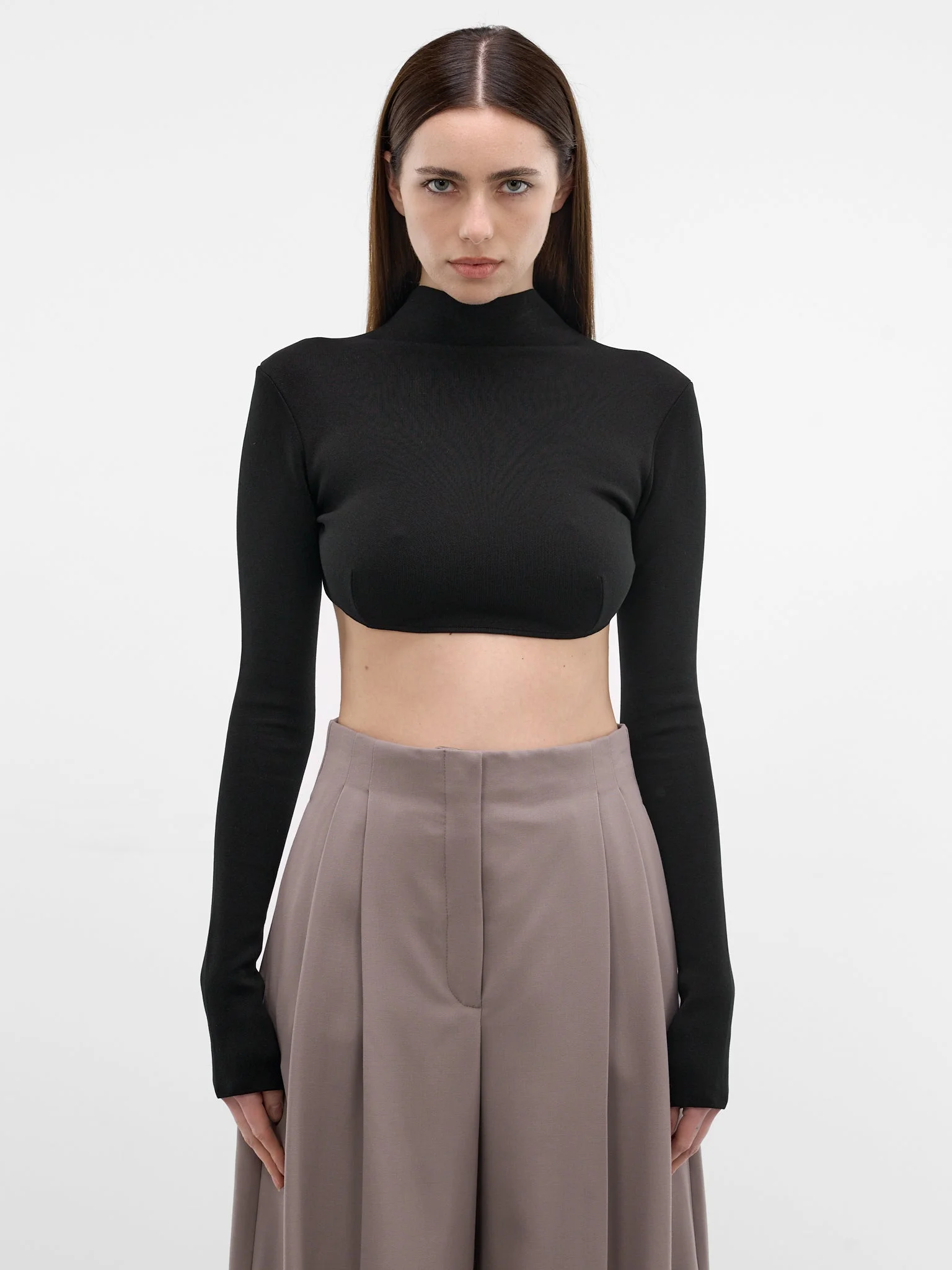 Top in black with mock neck and open back. Featuring: • Slim fit • Mock neck • Long sleeves • Open back • Darting at bust • Cropped length • Standard sizing Model is 5'8" wearing size S. Bust: 32” Waist: 25” Hips: 35”