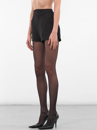 Black mini shorts in viscose-wool blend with high waist, concealed back zipper, and side flap pockets. Featuring: • Tailored fit • High-waisted • Concealed zipper in back with snap button • Side flap pockets • Mini length • Fully lined • Remake From the Lingerie pret-a-porter collection fall/winter 1998-1999 • Made in Ukraine • Main Fabric: 78% Viscose 22% Wool | Lining: 100% Cupro • French sizing Model is 5'9" wearing size 36. Bust: 32" Waist: 23" Hips: 34"