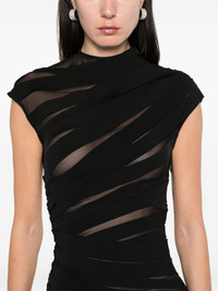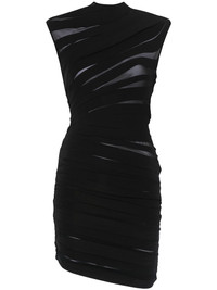 ruched sheer mini dress Highlights - Black - Stretch-design - Semi-sheer construction - Ruched detailing - Shoulder zip fastening - Stand-up collar - Cap sleeves - Thigh-length Imported Composition Polyamide 94%, Elastane 6% SIZE & FIT Model measurements Height 5 ft 10 in(1.78 m) Bust/Chest 33.46 in(85 cm) Hips 36.22 in(92 cm) Waist 23.22 in(59 cm) FittingInformation Designed for a close fit throughout Made from a midweight stretch fabric, this piece offers elasticity and flexibility when worn Washing instructions Machine Wash