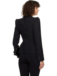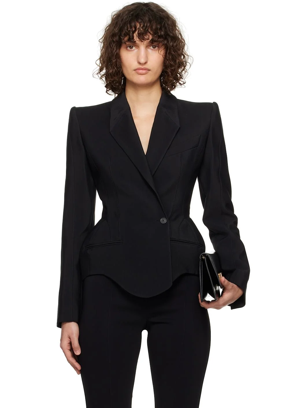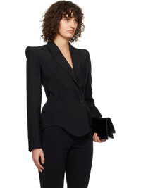Structured viscose- and virgin wool-blend twill blazer. Darts throughout. · Notched lapel · Welt pocket at chest · Double-breasted button closure · Welt pockets · Curved hem · Padded shoulders · Four-button surgeon's cuffs · Full cupro satin lining Supplier color: Black Body: 76% viscose, 24% virgin wool. Lining: 100% cupro. Made in Slovakia (Slovak Republic) 251345F057002