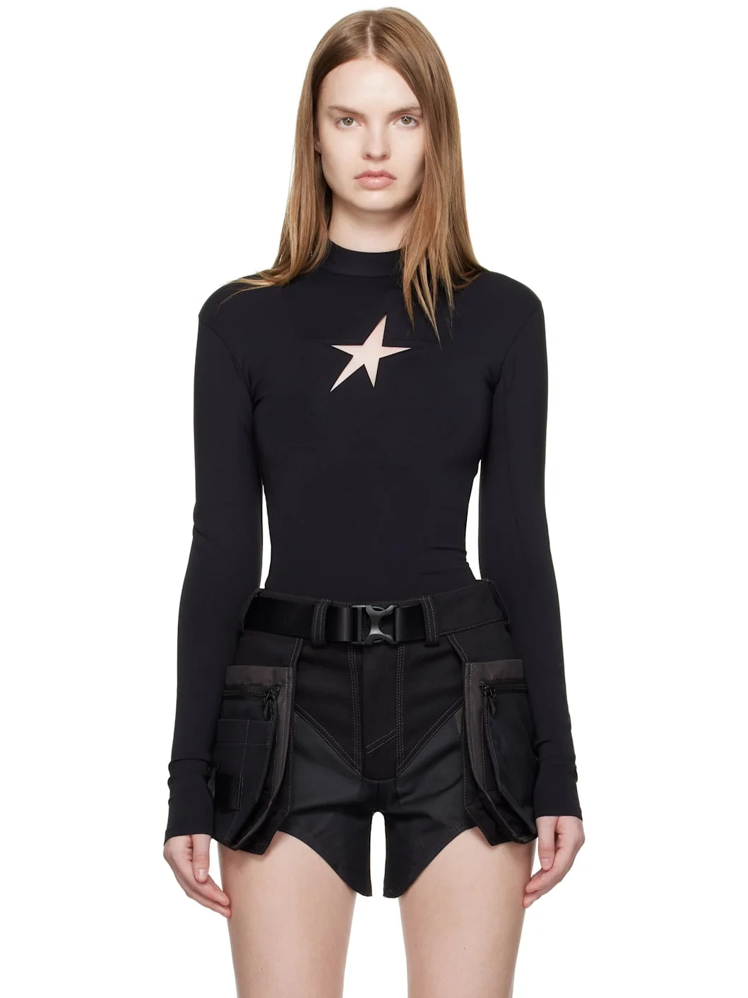 Stretch recycled jersey top. · Mock neck · Graphic cutout at chest · Concealed zip closure at back Supplier color: Black 75% recycled polyamide, 25% elastane. Made in Portugal 252345F099001