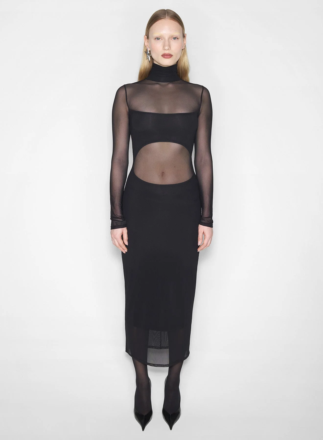 - Fitted dress in transparent mesh and stretch jersey underlayer - Contrasted transparent and opaque silhouette - Turtleneck collar - below the knee length - Racerback underlayer - Invisible zipper in the back DETAILS LINING:82% RECYCLE POLYAMIDE 18% ELASTANE MAIN FABRIC:94% RECYCLE POLYAMIDE 6% ELASTANE made in TUNISIA style: 25F3RO1787595