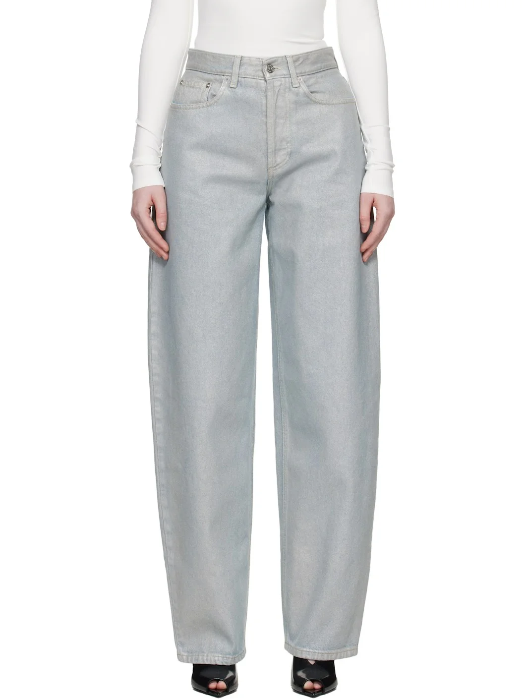 Foil-coated non-stretch denim jeans. · Fading throughout · Belt loops · Five-pocket styling · Button fly · Logo patch at back waistband · Lace-up fastening at back · Contrast stitching in tan Supplier color: Medium blue 100% cotton. Made in Italy 252345F069002