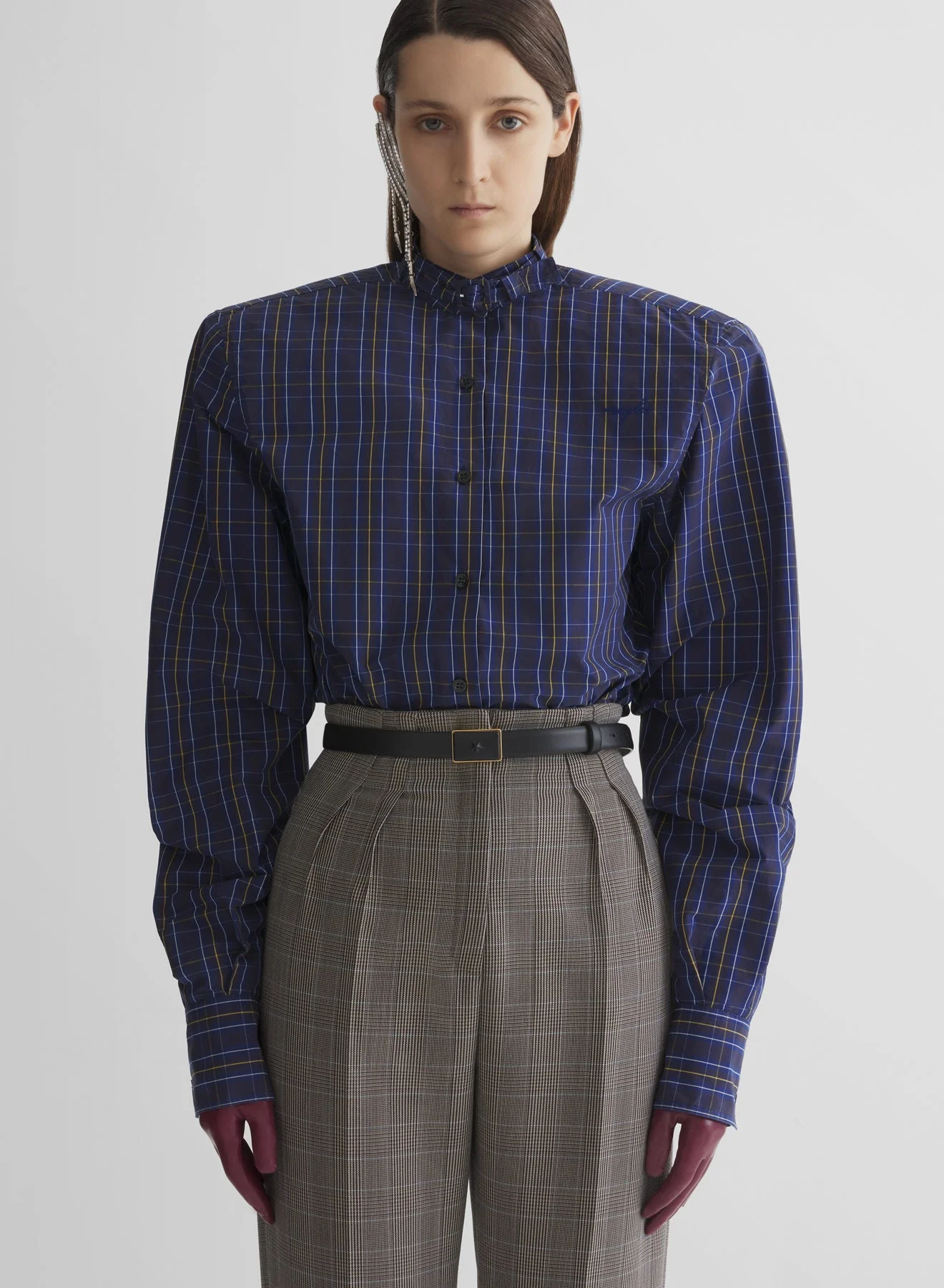 - Boxy shirt in checked cotton - Stand collar with loops - Statement padded shoulders - Button placket with mother-of-pearl buttons - Embroidered logo - Buttoned cuffs - Model is 180 cm / 5'11" and is wearing a size 36 DETAILS MAIN FABRIC:96% SILK 4% ELASTANE made in PORTUGAL style: 26P1TO0856273