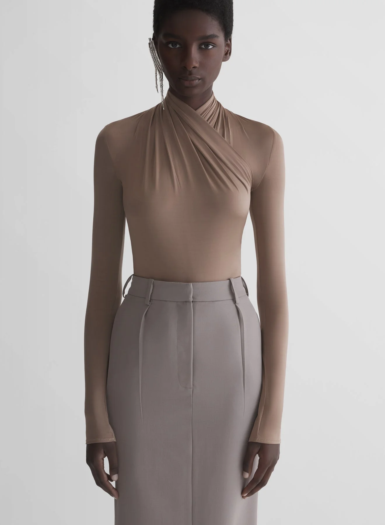 - Fitted bodysuit in light shiny jersey - High twisted collar - Long fitted sleeves - Invisible zipper - Snap button fastening at the bottom - Model is 177 cm / 5'10" and is wearing a size 36 DETAILS MAIN FABRIC:90% LYOCELL 10% SILK made in PORTUGAL style: 26P3BO02896030