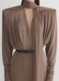 - Draped sheath dress in light shiny jersey - Wrapped scarf collar with a plunging V-neckline - Statement padded shoulders - Invisible zipper - Side-seam pockets - Flared skirt - Mid-calf length - Model is 180 cm / 5'11" and is wearing a size 36 DETAILS LINING:96% SILK 4% ELASTANE MAIN FABRIC:96% SILK 4% ELASTANE made in BULGARIA style: 26P1RO18066030