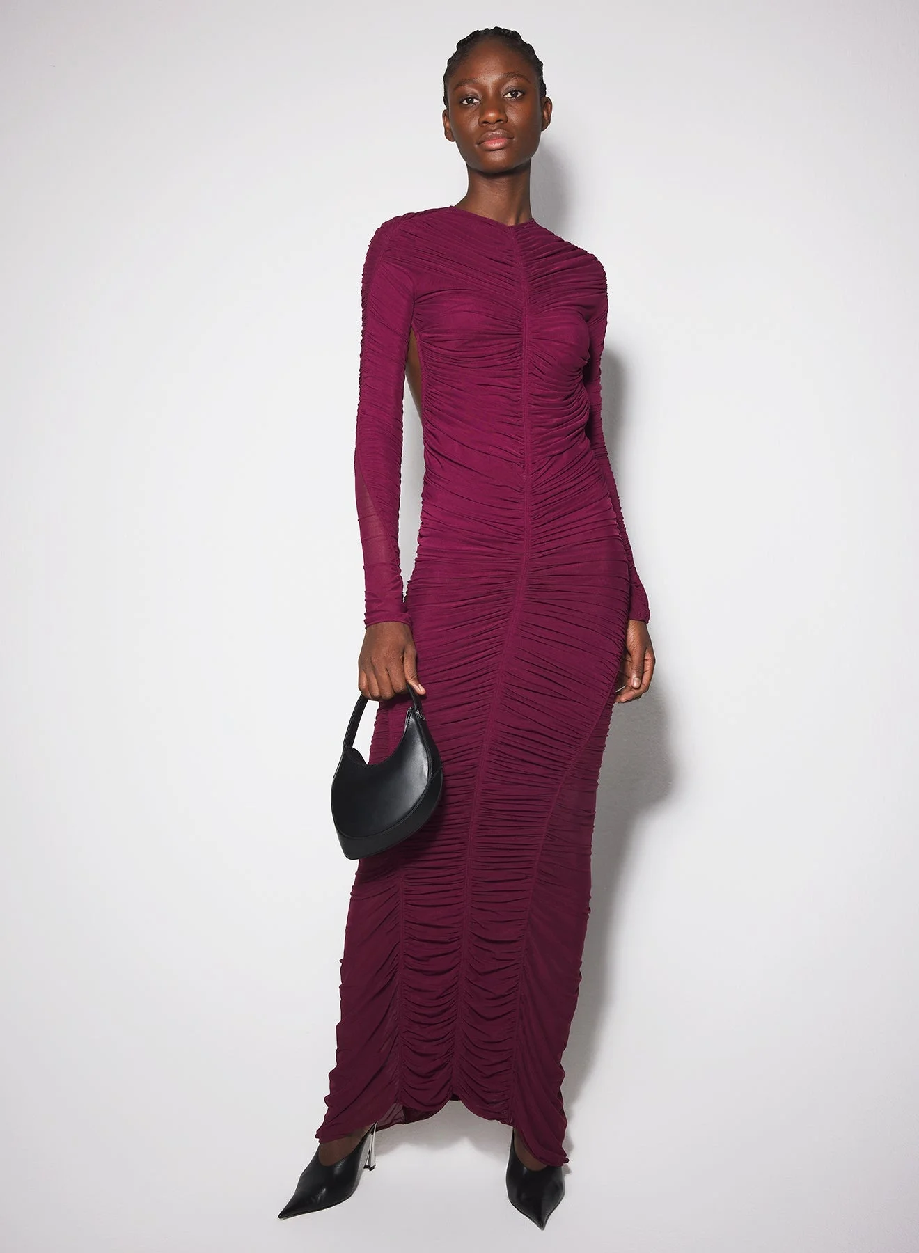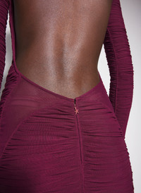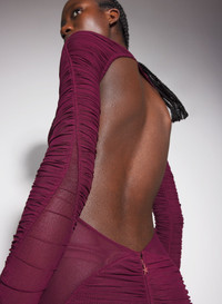 - Backless ruched mesh dress - multi-layered - rounded collar - long sleeves DETAILS 94% POLYAMIDE 6% ELASTHANE Made in PORTUGAL Style: 24F1RO1614595