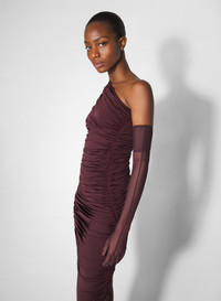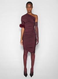 burgundy one-shoulder marabou dress
