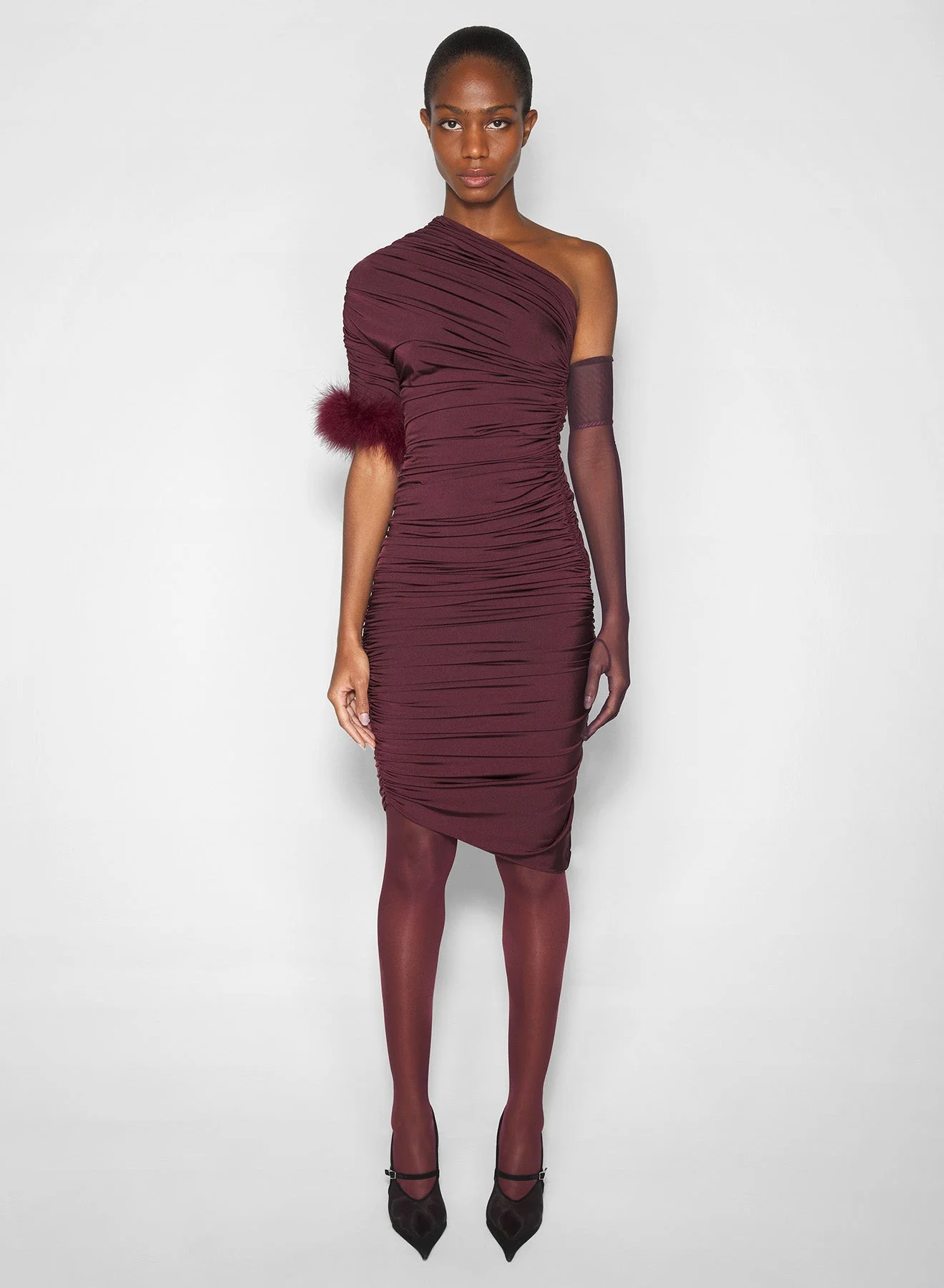 - Fitted dress in lightweight jersey - draped silhouette with gathered seams - Asymmetric oneshoulder neckline - Short sleeve with handsewn marabou feather trim - Invisible zipper on the side - draped Asymmetric kneelength hem DETAILS MAIN FABRIC:82% RECYCLE POLYAMIDE 18% ELASTANE made in PORTUGAL style: 25F3RO1788688