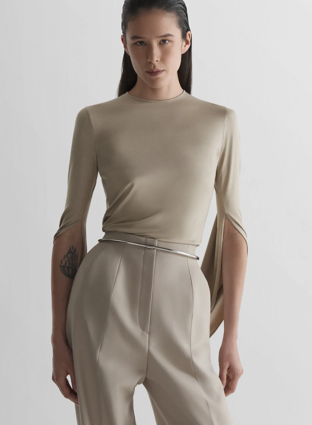 - Fitted cascade top in fluid silk jersey - Round neck - Long slit sleeves that loop around the back - Open Cut-out back - Signature loop on the back - Model is 181 cm / 5'11" and is wearing a size 36 DETAILS MAIN FABRIC:44% COTTON 28% SILK 27% CUPRO 1% POLYAMIDE made in PORTUGAL style: 26S3TO08823012