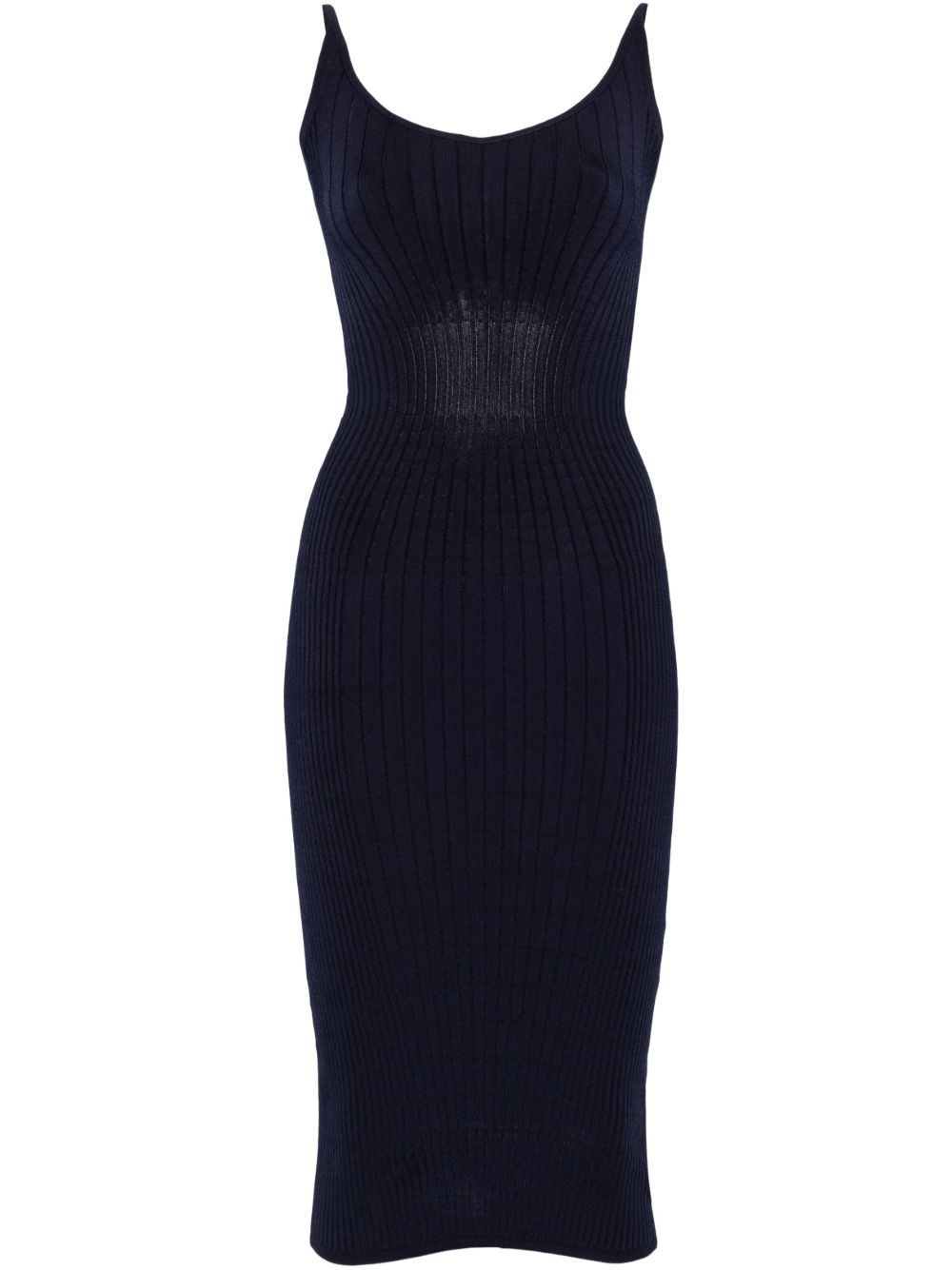 ribbed midi dress Highlights - Midnight blue - Ribbed knit - V-neck - Spaghetti straps - Fitted waistline - Unlined - Straight hem - Mid-length Imported Composition Rayon 87%, Nylon 11%, Elastane 2% SIZE & FIT Model measurements Height 5 ft 10 in(1.77 m) Bust/Chest 32.67 in(83 cm) Hips 37 in(94 cm) Waist 24.8 in(63 cm) FittingInformation Designed for a close fit throughout Made with a midweight knit, this piece offers some stretch