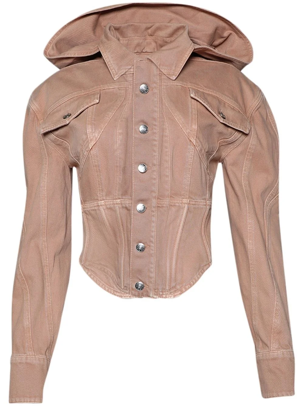 corseted denim jacket Highlights - Clay - Cotton - Denim - Corset style - Front button fastening - Exposed-seam detailing - Classic collar - Classic hood - Long sleeves - Buttoned cuffs - Two chest flap pockets - Curved hem Made in Italy Composition Cotton 100% SIZE & FIT FittingInformation Designed for a close fit throughout Sturdy and hard-wearing, this denim piece offers no stretch Washing instructions Read Manufacturer Guidelines