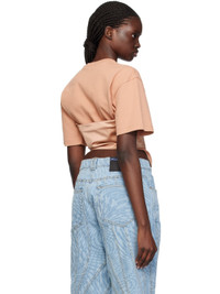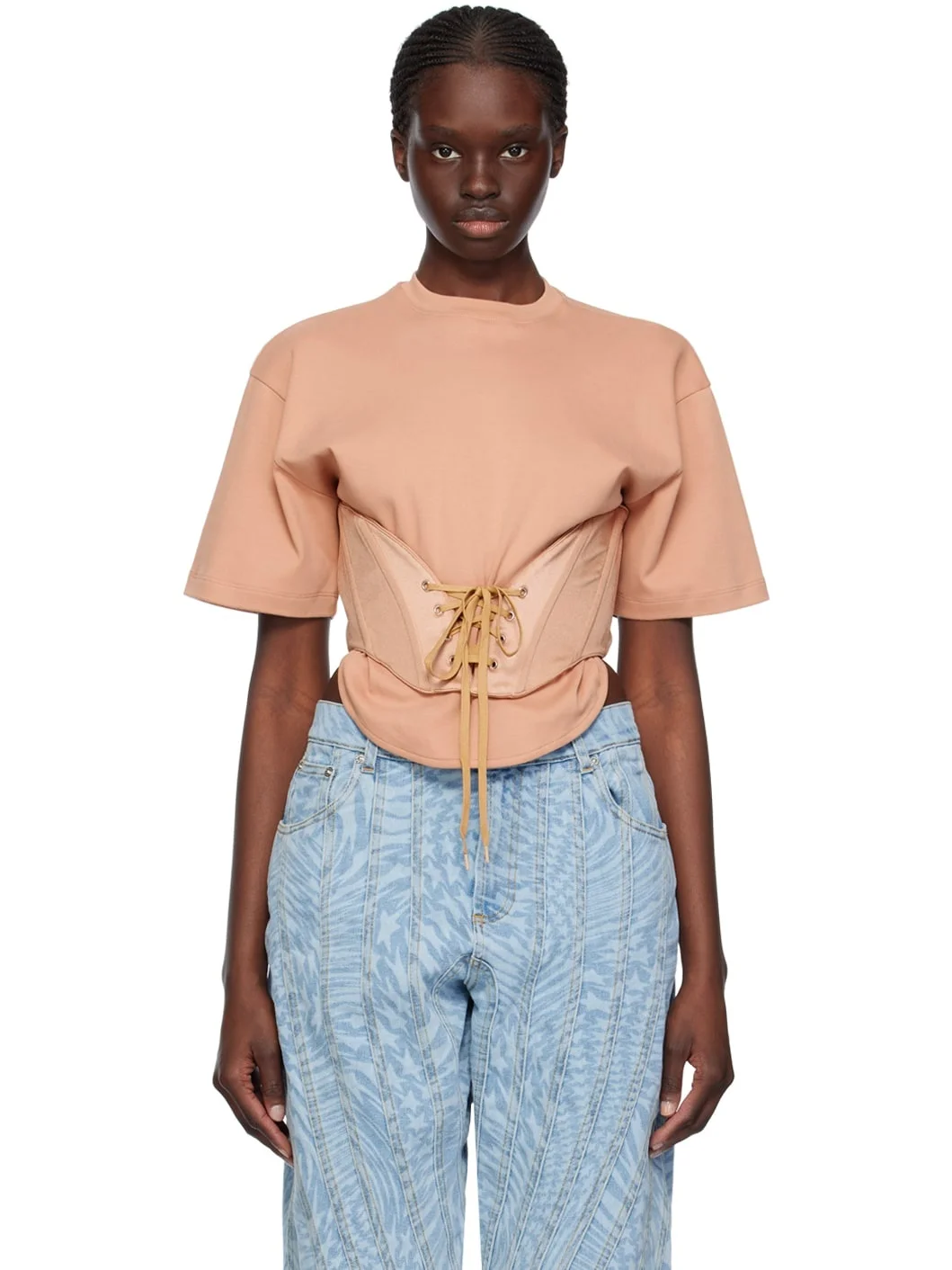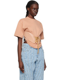 Cotton jersey T-shirt. · Rib knit crewneck · Stretch nylon jersey trim at hem · Boning and lace-up detailing at hem · Gathering at back hem Supplier color: Tan/Tan Body 1: 100% cotton. Body 2: 80% polyamide, 20% elastane. Made in Portugal 241345F110028
