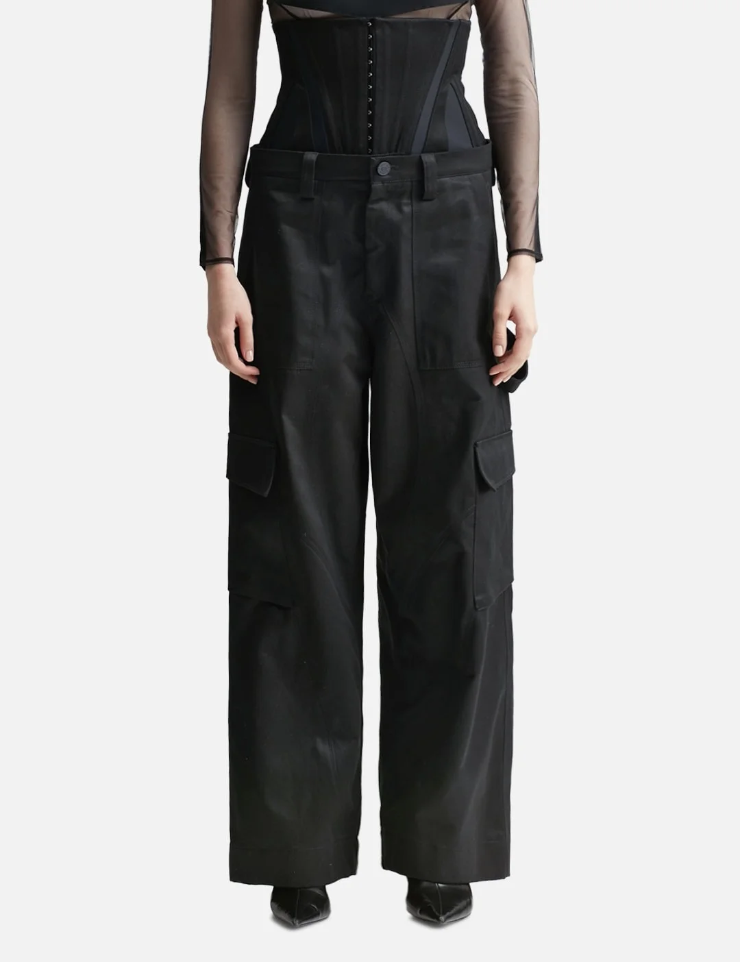 - MUGLER - Corset Cargo Pants - Croset panelled design - Hook closure on the corset - Streamlined layered on the corset - Wide-leg - High waist - Two welt side pockets - Two welt pockets at the rear; Two cargo pockets at the legs - Zip closure - Color: Black - Material: 100% Cotton; 78% Polyamide, 22% Elastane - See more Pants and Clothing SIZING - Model wears size 36 - Model measures: Height 181cm, Chest 33”/84cm, Waist 24”/61cm, Hip 35”/90cm