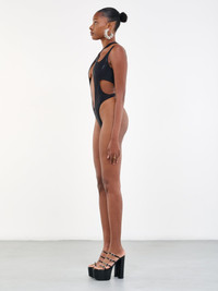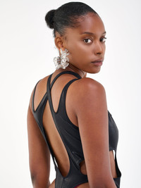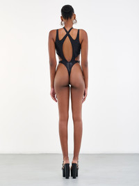 MUGLER swimsuit in black, crossed one-pice design, thong-shaped bottom, front & back cut-outs, nap clasp fastening, fitted. Made in Macedonia Italian Sizing Main - 80% Polyamide, 20% Elastane Second- 84% Polyamide, 16% Elastane Model is 5'10" wearing size 36. Bust: 32" Waist: 27" Hips: 34"