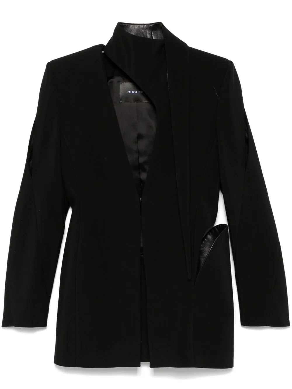 cut out-detail blazer Highlights - Black - Twill weave - Cut-out detailing - Front hook and eye fastening - Leather trim - Asymmetric neck - Scarf detailing - Shoulder pads - Long sleeves - Central rear vent - Full lining - Straight hem Imported Composition Outer: Viscose 76%, Virgin Wool 24% Lining: Cupro 100% Coating: Lamb Skin 100% SIZE & FIT Model measurements Height 5 ft 10 in(1.77 m) Bust/Chest 33.07 in(84 cm) Hips 37 in(94 cm) Waist 24.8 in(63 cm) FittingInformation Designed for a slim fit that sits just away from the body offering a close yet comfortable fit The internal shoulder pads offer a structured shape Made from a midweight non-stretch fabric Washing instructions Do Not Wash/Do Not Dry Clean