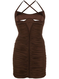 cut-out ruched minidress Mugler's minidress speaks to the brand's penchant for form-fitting silhouettes. Cut from ruched stretch-jersey with slim crossover straps, it's punctuated with carefully placed cut-outs beneath the bust. Highlights - Chocolate brown - Stretch-design - Cut-out detailing - Ruched detailing - Crossover shoulder straps - Concealed rear zip fastening - Thigh-length Imported Composition Polyamide 80%, Elastodiene 20% SIZE & FIT Model measurements Height 5 ft 9 in(1.76 m) Bust/Chest 31.88 in(81 cm) Hips 35.43 in(90 cm) Waist 24.8 in(63 cm) Measurement BUST 24.4 in(62 cm) LENGTH 22.44 in(57 cm) WAIST 21.25 in(54 cm) HIPS 27.55 in(70 cm) FittingInformation Designed for a very close and sculpting fit The adjustable shoulder straps allow for a preferred fit when worn Made from a lightweight stretch fabric, this piece offers elasticity and flexibility when worn This piece fits true to size – take your usual size Washing instructions Hand Wash