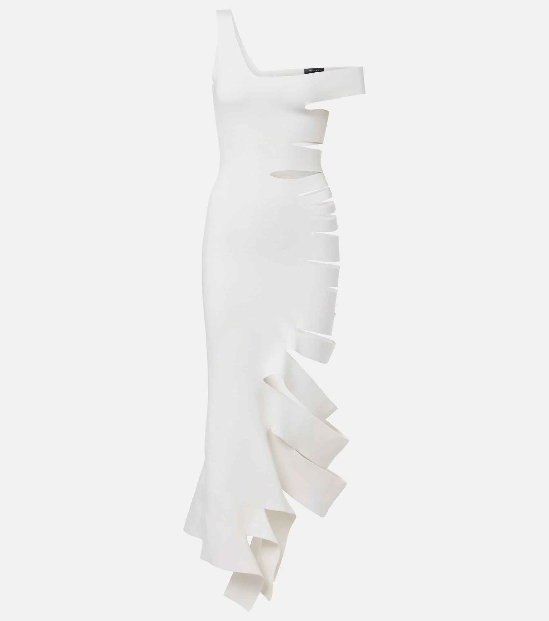 This midi dress from Mugler features a figure-sculpting silhouette complete with striking cutouts along the side. The bandage knit design is complete with a flattering asymmetric neckline. Product Details - Material: 72% viscose, 26% polyamide, 2% elastane - Care instructions: machine wash at 40 degrees - Made in Portugal - Designer color name: Snow - Item color: white - Item number: P01028453 Size & Fit - Fits small to size - we recommend trying one size larger - Fitted - Slightly stretchy fabric - The model seen in the picture is 178cm-5'10" and wearing a size S