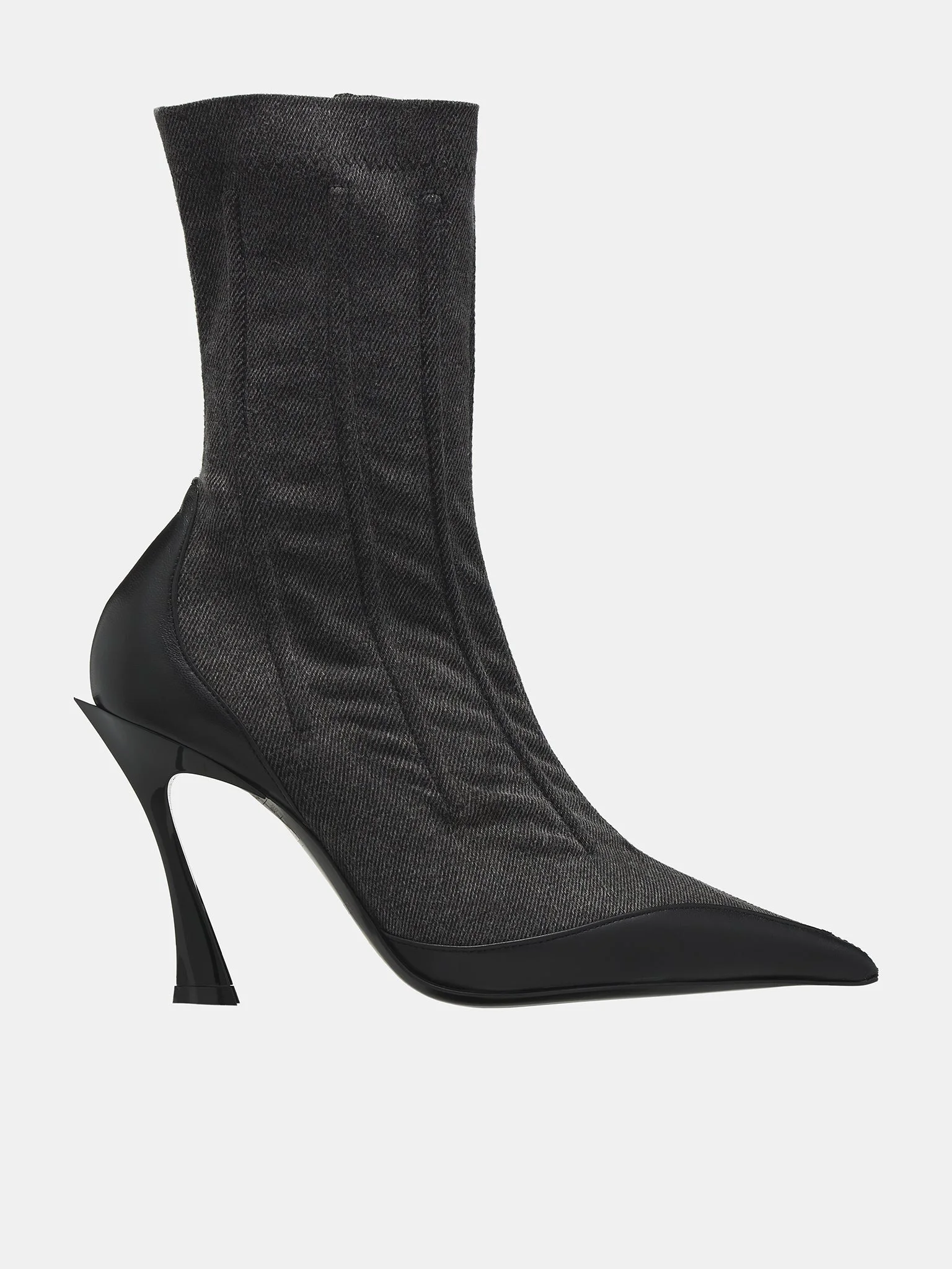 MUGLER boots in black, paneled denim upper, mid-top, side zip closure, leather heel & toe cap, stiletto heel, pointed toe, leather sole. European Sizing