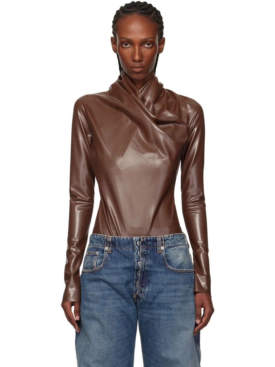 Lightweight rubber bodysuit. · Offset draped collar · Zip closure at back · Press-stud closure at bottom · Unlined Supplier color: Chocolate 100% rubber. Made in France 261345F358008