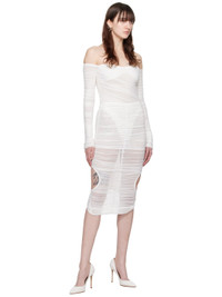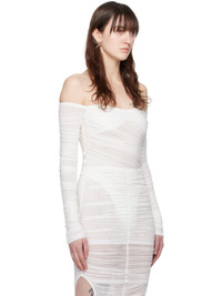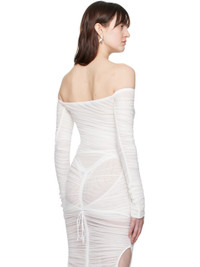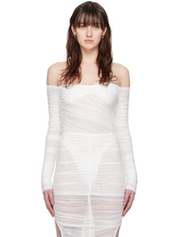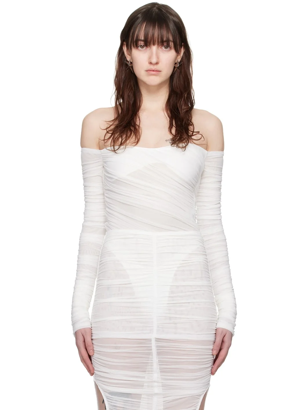 Semi-sheer stretch nylon mesh bodysuit. Gathering and ruching throughout. · Off-the-shoulder construction · Straight neck · Press-stud fastening at bottom · Zip closure at side seam · Full mesh lining Supplier color: White Body: 94% polyamide, 6% elastane. Trim: 78% polyamide, 22% elastane. Lining: 95% cotton, 5% elastane. Made in France 241345F358052