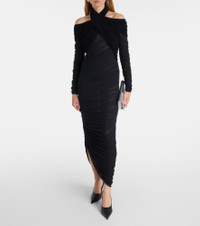 Best known for its sculptural silhouettes, the Parisian house of Mugler challenges conventional fashion design. This mesh maxi dress features a velvet halterneck overlay, an asymmetric hemline, and elegant draping with gathered detailing. Product Details - Material: 94% polyamide (recycled), 6% elastane (recycled) - Care instructions: dry clean - Made in Tunisia - Designer color name: Black - Item color: black - Material II: 57% polyester, 43% polyamide - Closure: invisible zipper - Item number: P01060861 Size & Fit - True to size - Semi-sheer - Fitted - Slightly stretchy fabric - The model seen in the picture is 178cm-5'10" and wearing a size FR 36