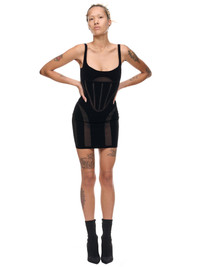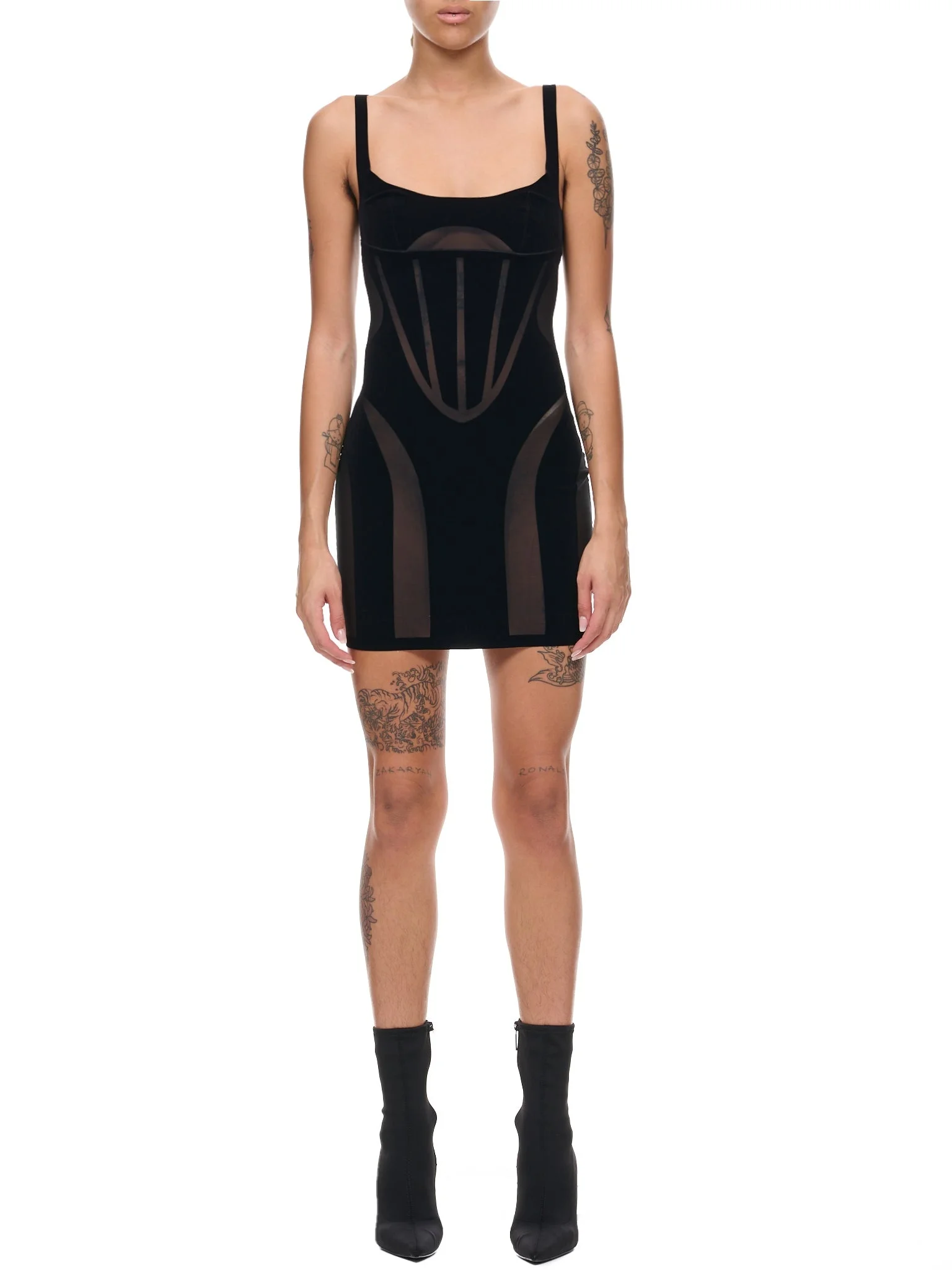 MUGLER dress in black, shaping design, lightweight tulle, semi-sheer, contrasting flocked panels, scoop neckline, mini length, sculpting fit. Standard Sizing 67% Polyester, 33% Polyurethane Model is 5'9.5" wearing size XS. Bust: 32" Waist: 26" Hip: 35"