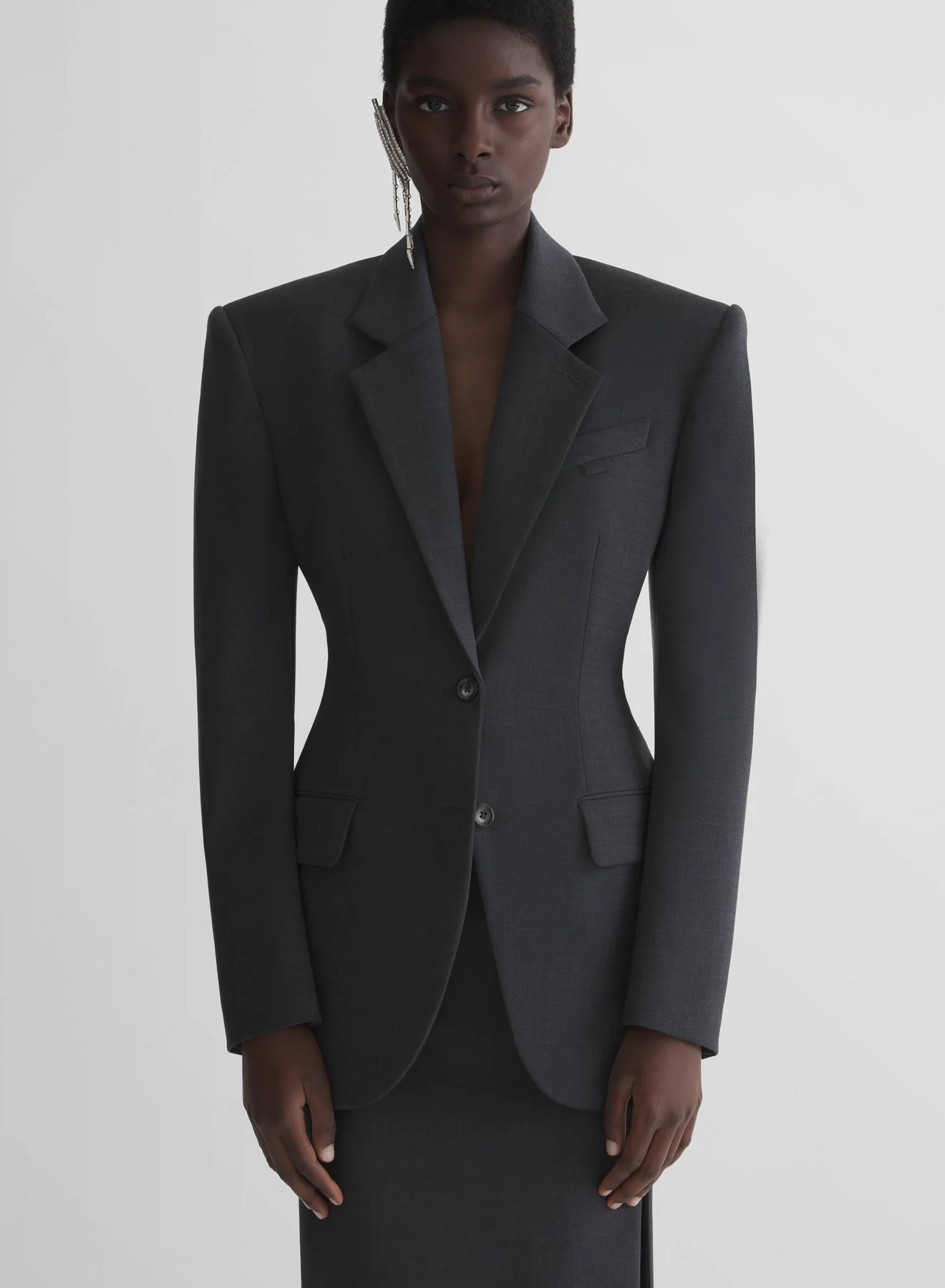 - Oversized hourglass blazer in bonded melange wool - Notched lapel - Wide padded shoulders - Welt pocket with signature loop and flap pockets - Horn buttons - Back vent - Fully lined with pinstriped sleeve interior - Model is 177 cm / 5'10" and is wearing a size 36 DETAILS made in UKRAINE style: 26P1VE04841018