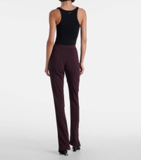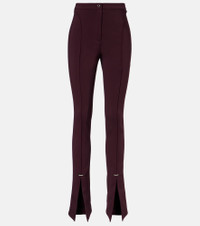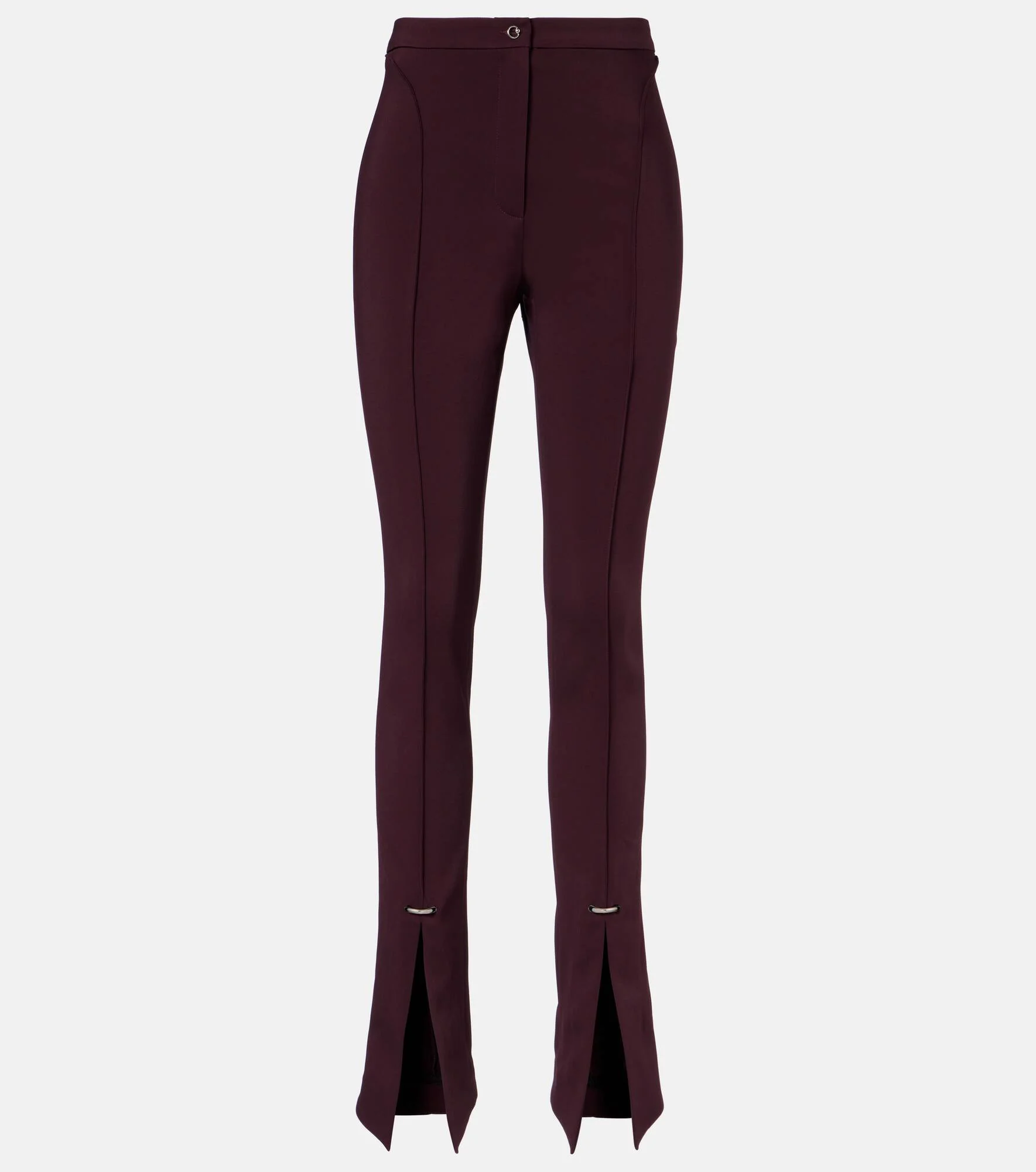 Best known for its sculptural silhouettes, the Parisian house of Mugler challenges conventional fashion design. Made from stretchy material, these pants are cut to a high-rise, skinny silhouette, with split hems and silver-toned detailing. Product Details - Material: 96% viscose, 4% elastane - Care instructions: dry clean - Made in Bulgaria - Designer color name: Dark Plum - Item color: purple - Closure: zip and button fastening - Hardware color: silver - Item number: P01060846 Size & Fit - True to size - Slightly stretchy fabric - Slim-leg with a flared hem - High-waisted - The model seen in the picture is 178cm-5'10" and wearing a size FR 36