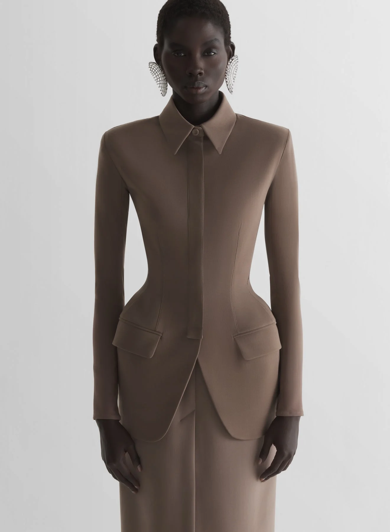 - lightweight shirt jacket in stretch wool - Pointed collar - Hidden horn buttons with one visible button - Hourglass rounded hips - Flap pockets - Long sleeve cuffs - Model is 181 cm / 5'11" and is wearing a size 36 DETAILS SECOND LINING:100% CUPRO LINING:100% COTTON MAIN FABRIC:53% POLYESTER 43% VIRGIN WOOL 4% ELASTANE made in UKRAINE style: 26S1VE04831032