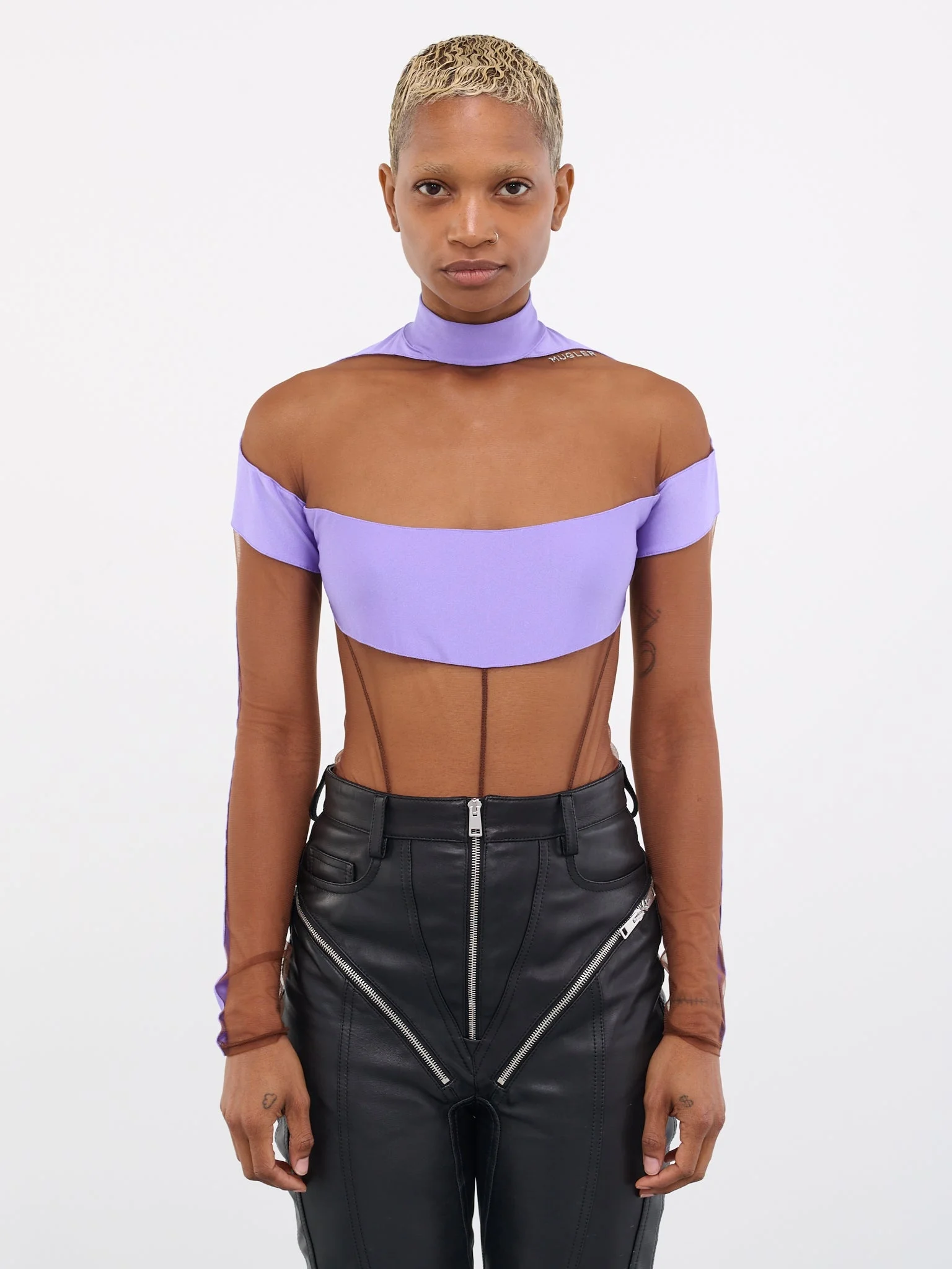 MUGLER bodysuit in purple, signature illusion design, paneled construction, sheer stretch nylon tulle & satin, metal logo detail, mock neck, long sleeves, bottom press-stud fastening, back zip closure, partial lining, fitted. Made in Portugal Italian Sizing Body 1 - 80% Nylon, 20% Elastane Body 2 - 77% Nylon, 23% Elastane Lining - 100% Cotton Model is 5'7" wearing size 36. Bust: 32" Waist: 24" Hips: 34"