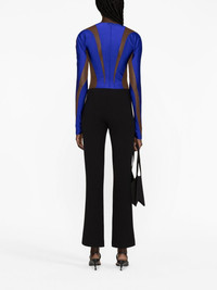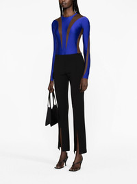 Illusion panelled bodysuit Mugler's illusion designs are a longstanding trope, and this ultraviolet blue bodysuit continues that legacy. It combines jersey panels with sheer tulle to create the mirage of daring and spiralling cut-outs through the bodice and arms. Highlights - Ultra violet blue - Stretch-jersey - Mesh panelling - Rear zip fastening - Round neck - Long sleeves - Thong style - Press-stud fastening at base - Just a reminder that this piece must be tried on over your own garments. Imported Composition Cotton 100%, Polyamide 80%, Spandex/Elastane 20% SIZE & FIT Model measurements Height 5 ft 11 in(1.8 m) Bust/Chest 34.25 in(87 cm) Hips 35.82 in(91 cm) Waist 24.8 in(63 cm)