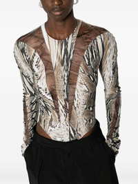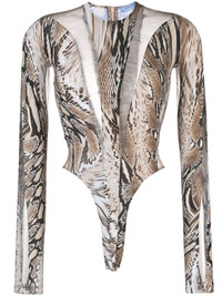 Illusion sheer-panelled bodysuit Mugler's affinity for illusion designs is well-documented, and this snakeskin-print bodysuit continues that legacy. It combines jersey panels with sheer tulle inserts to create the effect of daring cut-outs. Highlights - Beige/brown/black - Stretch-cotton - Sheer panels - Panelled design - Round neck - Rear zip fastening - Long sleeves - Just a reminder that this piece must be tried on over your own garments. Imported Composition Lining: Cotton 100% Outer: Polyamide 78%, Spandex/Elastane 22% SIZE & FIT Model measurements Height 5 ft 10 in(1.77 m) Bust/Chest 32.28 in(82 cm) Hips 35.03 in(89 cm) Waist 25.19 in(64 cm) FittingInformation Designed for a close fit throughout Made from a midweight stretch fabric, this piece offers elasticity and flexibility when worn This piece fits true to size – take your usual size Washing instructions Dry Clean Only