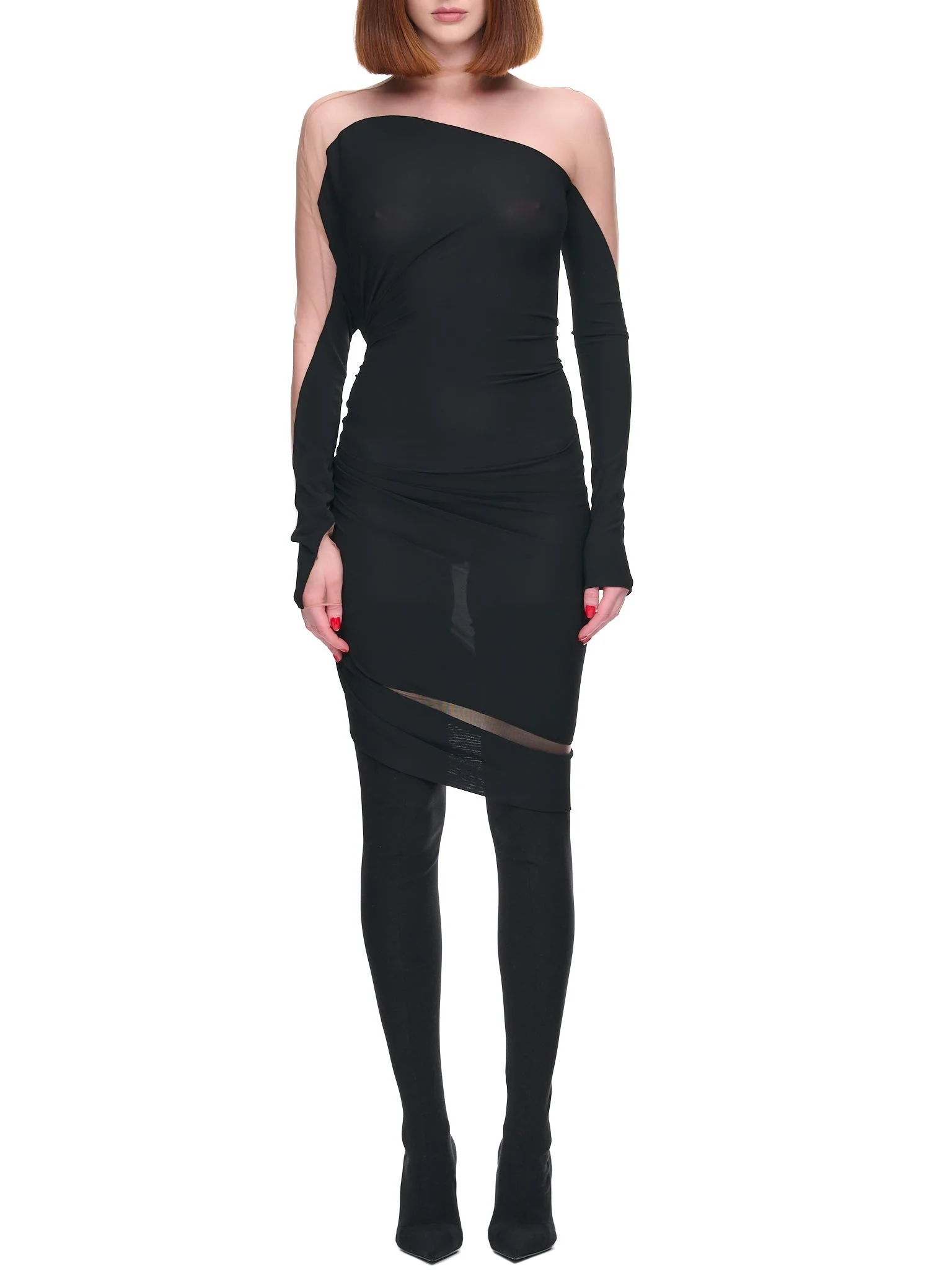 MUGLER dress in silver nude, draped design, stretch jersey, off-the-shoulder illusion cut, sheer tulle, cut-out detail, long sleeves, back zip fastening, mini length, fitted. Made in Portugal Italian Sizing Main - 95% Polyamide, 5% Elastane Second - 77% Polyamide, 23% Elastane Model is 5'7" wearing size 36. Bust: 32" Waist: 25" Hip: 37"