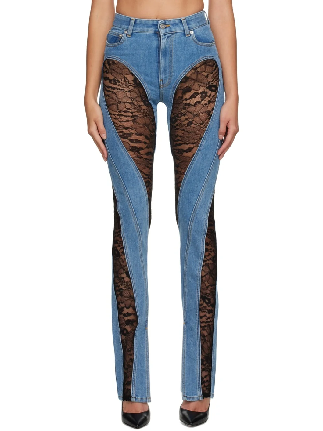 Skinny-fit stretch denim jeans. Lace trim throughout. · Paneled construction · Belt loops · Five-pocket styling · Zip-fly · Leather logo patch at back waistband · Contrast stitching in tan Supplier color: Medium blue/Black Body 1: 72% cotton, 28% elastomultiester. Body 2: 38% polyamide, 38% viscose, 24% elastane. Made in Italy 232345F069023