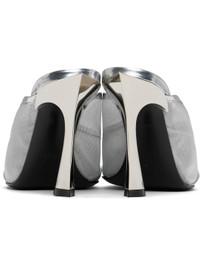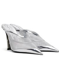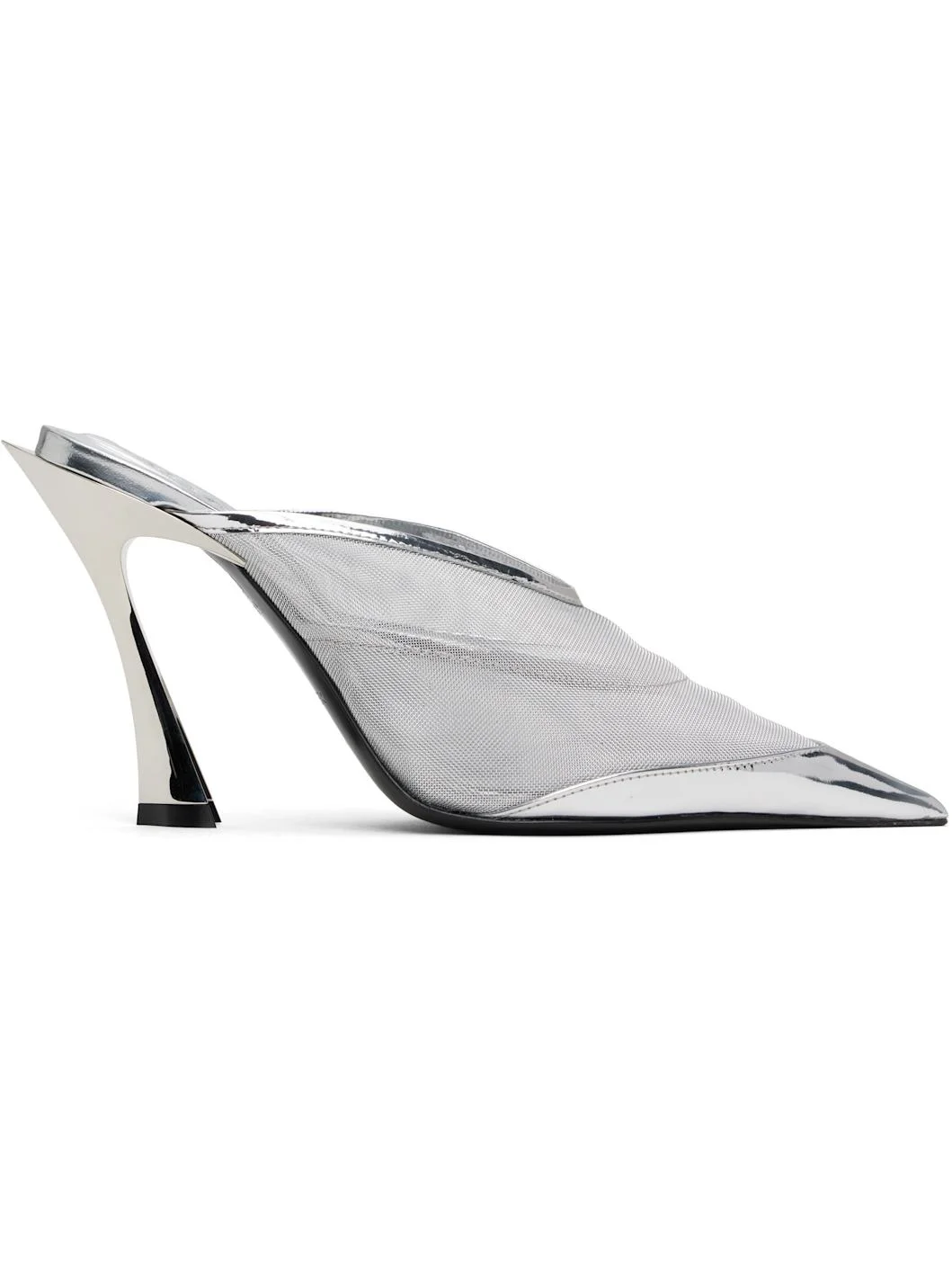 Goatskin patent leather and mesh heels in silver tone. · Pointed toe · Logo embossed at leather footbed · Metal stiletto heel with rubber injection · Leather sole with rubber injection · Heel: H4" Supplier color: Silver Upper: goatskin, textile. Sole: leather, rubber. Made in Italy 251345F122000