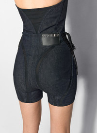 black mesh laced-up raw denim shorts