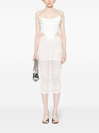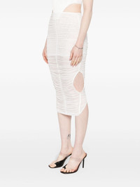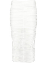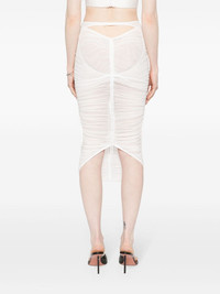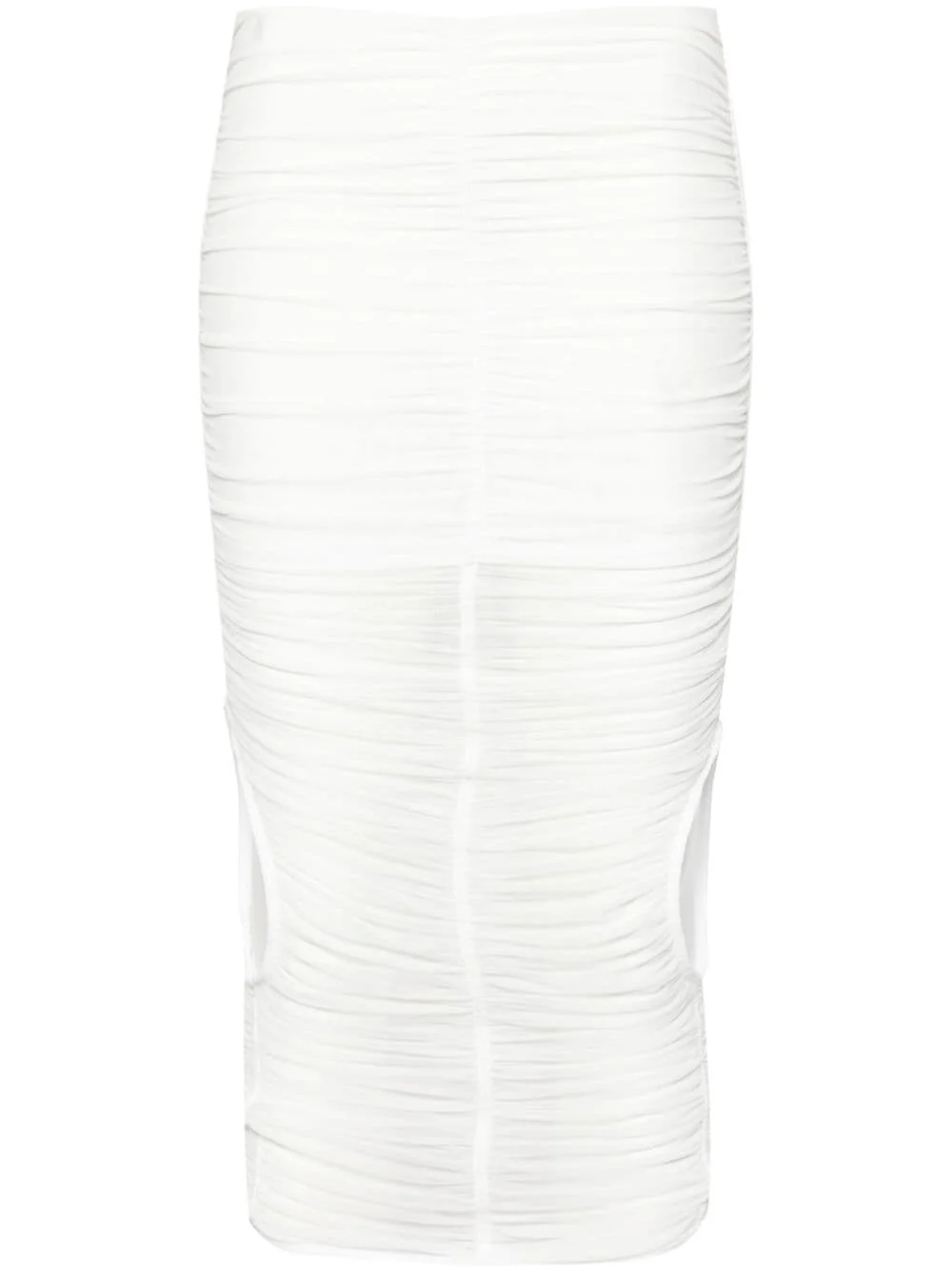 mesh ruched midi skirt Highlights - White - Stretch-design - Mesh panelling - Ruched detailing - Cut-out detailing - Bow detailing - Internal logo tag - Partial lining - Mid-length - Curved hem Imported Composition Polyamide 94%, Elastane 6% SIZE & FIT Model measurements Height 5 ft 9 in(1.75 m) Bust/Chest 34.64 in(88 cm) Hips 36.61 in(93 cm) Waist 26.37 in(67 cm) FittingInformation This midi-length skirt is intended to be worn just below the waist Made from a lightweight stretch fabric, this piece offers elasticity and flexibility when worn This piece fits true to size – take your usual size