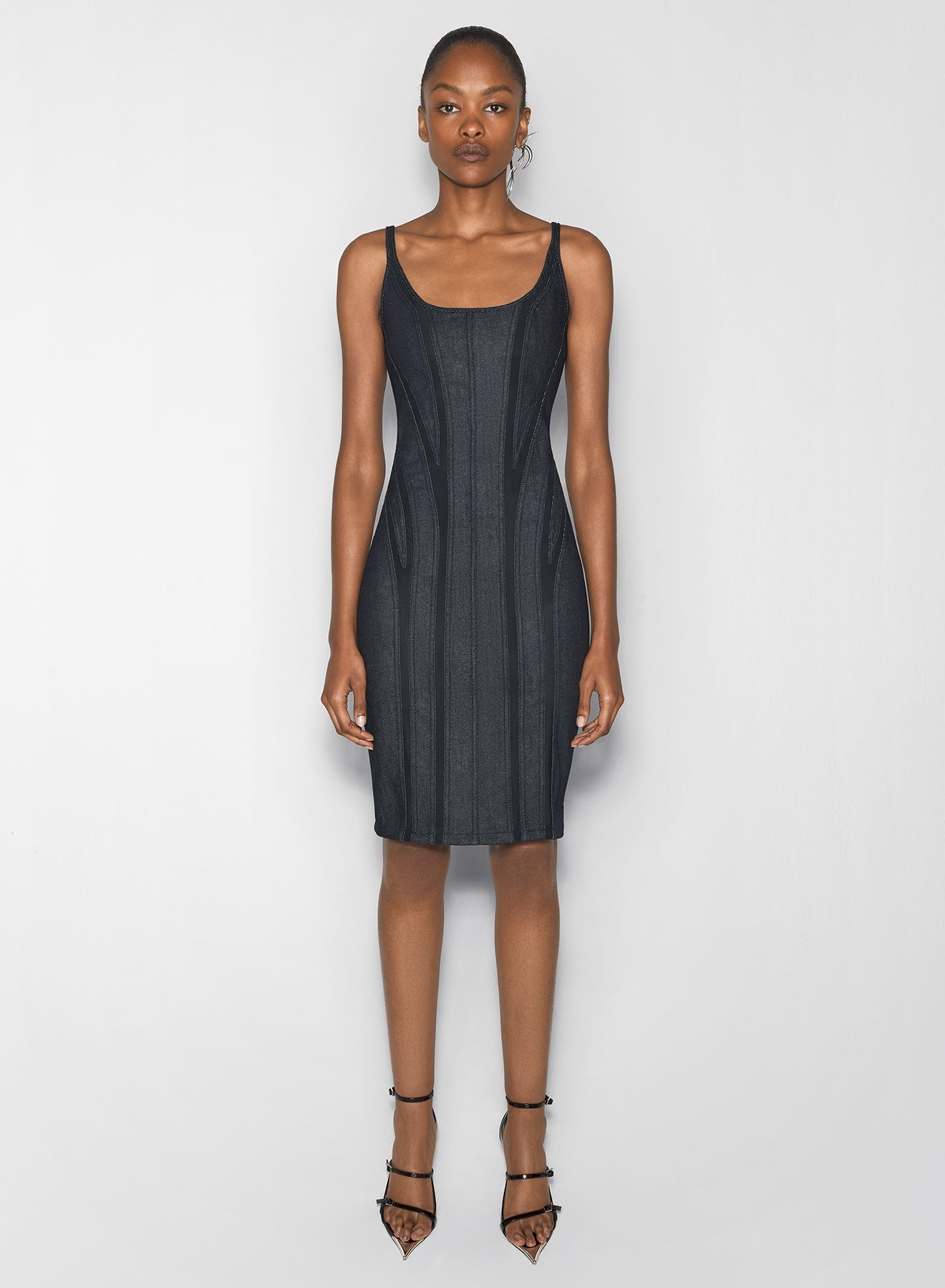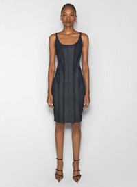 - Midi denim dress - Fitted silhouette - Scoop neck - Sleeveless - corseted effect - zip closing on back DETAILS FABRIC 1: 98% COTTON 2% ELASTANE FABRIC 2: 83% POLYAMIDE 17% ELASTANE Made in Italy Style: 25P6RO17172013