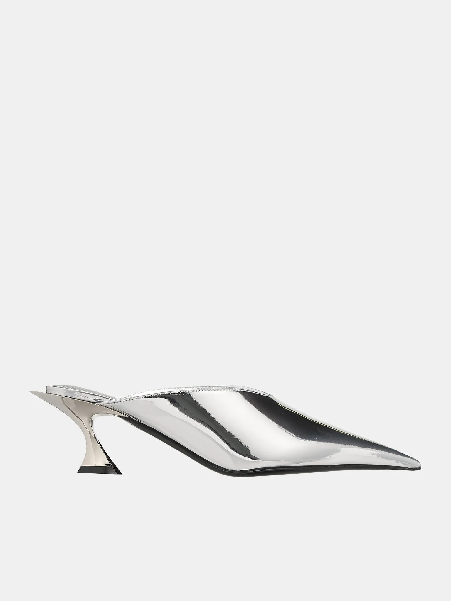 MUGLER mules in silver, leather construction, metallic finish, low-top, slip-on style, kitten heel, pointed toe, lined. Made in Italy Outer: 80% Leather 20% Rubber Inner: 100% Goat Leather European Sizing