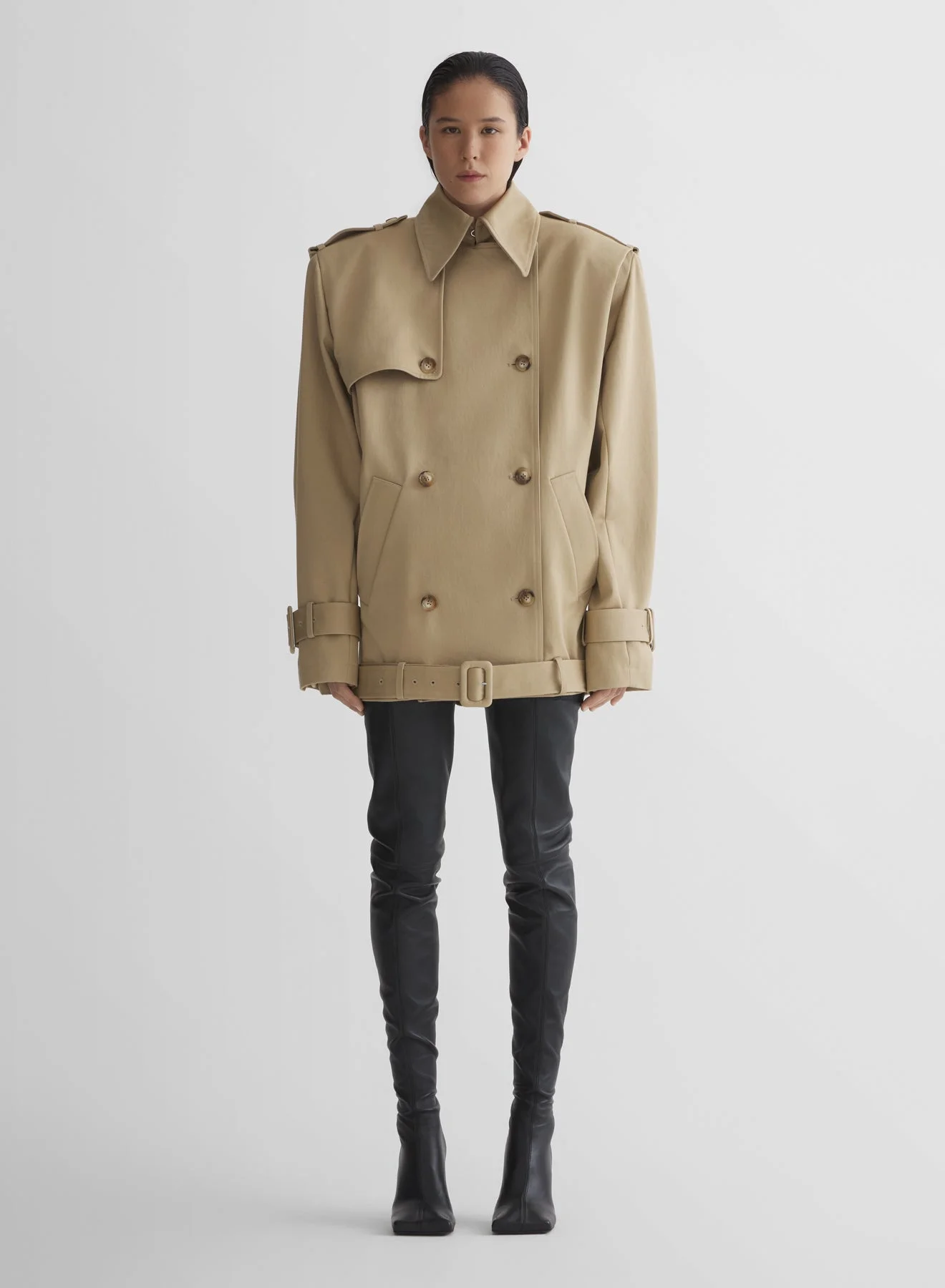 - Short boxy trench coat in crisp cotton gabardine - Pointed trench collar with hook closure - Structured padded shoulders - Buttoned storm flap - Double-breasted closure with horn buttons - Large welt pockets - Belted hem and sleeves with covered buckles - Fully lined - Model is 181 cm / 5'11" and is wearing a size 36 DETAILS DBL 1:100% CUPRO LINING:100% CUPRO MAIN FABRIC:55% POLYESTER 43% WOOL 2% ELASTANE made in UKRAINE style: 26P1MA0203272