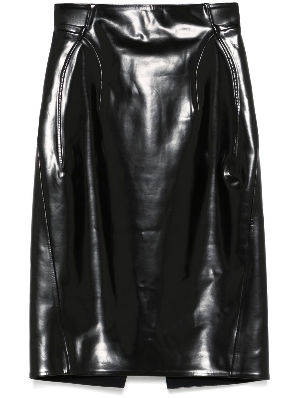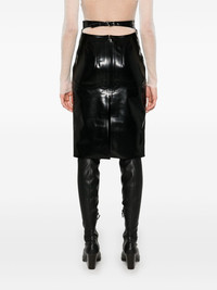 faux-leather mini skirt Highlights - Black - Faux leather - Smooth grain - Patent finish - Rear buckle fastening - Concealed rear hook and zip fastening - High waist - Dart detailing to the front - Cut-out detailing - Dart detailing to the rear - Rear slit - Full lining - Straight hem - Knee-length Imported Composition Polyurethane 52%, Polyester 48% SIZE & FIT Model measurements Height 5 ft 10 in(1.78 m) Bust/Chest 33.85 in(86 cm) Hips 36.61 in(93 cm) Waist 26.77 in(68 cm) FittingInformation This midi-length skirt is intended to be worn just below the waist The vented hem offers movement at the rear Made from a midweight non-stretch fabric, this piece offers minimal elasticity when worn