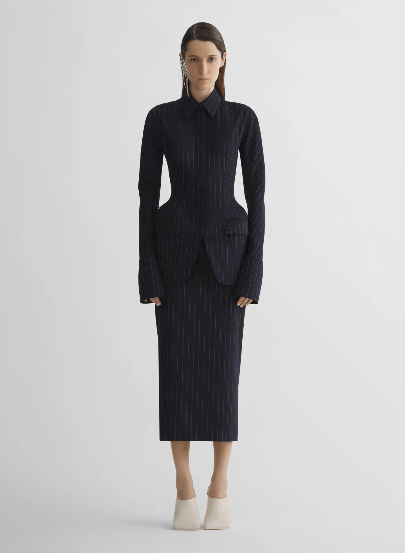 - Mid-rise tube skirt in stretch pinstriped wool - Draped asymmetric waist - Mid calf length - Back vent - Fully lined - Model is 180 cm / 5'11" and is wearing a size 36 DETAILS LINING:100% CUPRO MAIN FABRIC:55% VIRGIN WOOL 23% POLYESTER 22% POLYCHOROPRENE made in BULGARIA style: 26P1JU05841022