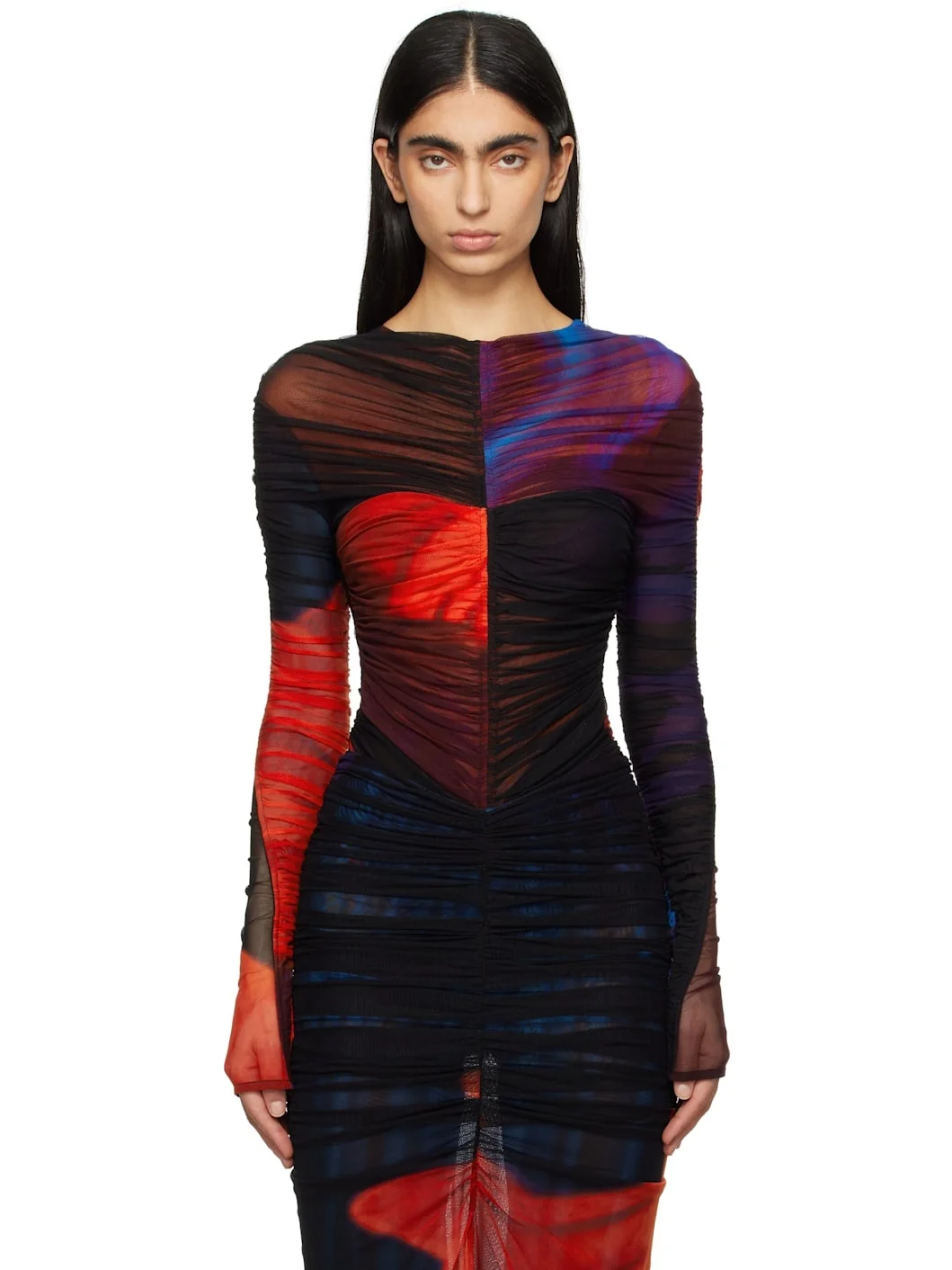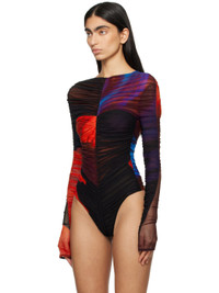 Semi-sheer stretch recycled nylon mesh bodysuit. Printed graphic and ruching throughout. · Crewneck · Central seam at front · Press-stud fastening at bottom · Concealed zip closure at back · Partial cotton jersey lining Supplier color: Print blue and red Body: 95% recycled polyamide, 5% elastane. Lining: 89% cotton, 11% elastane. Made in Tunisia 251345F358012