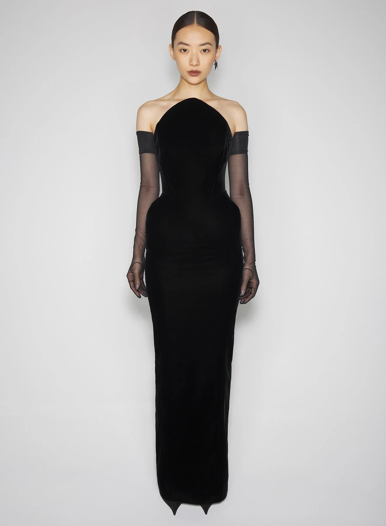 - long hourglass dress in fluid Japanese velvet - Circular shaped neckline - Integrated corset with pronounced hip pads - zipper in the back - long back slit DETAILS LINING:100% CUPRO MAIN FABRIC:100% POLYAMIDE SECOND FABRIC:66% RAYON 32% CUPRO 2% ELASTANE TISSU 3:78% SILK 22% POLYESTER made in BULGARIA style: 25F1RO1760477