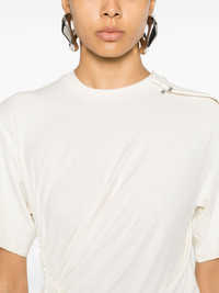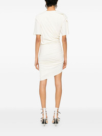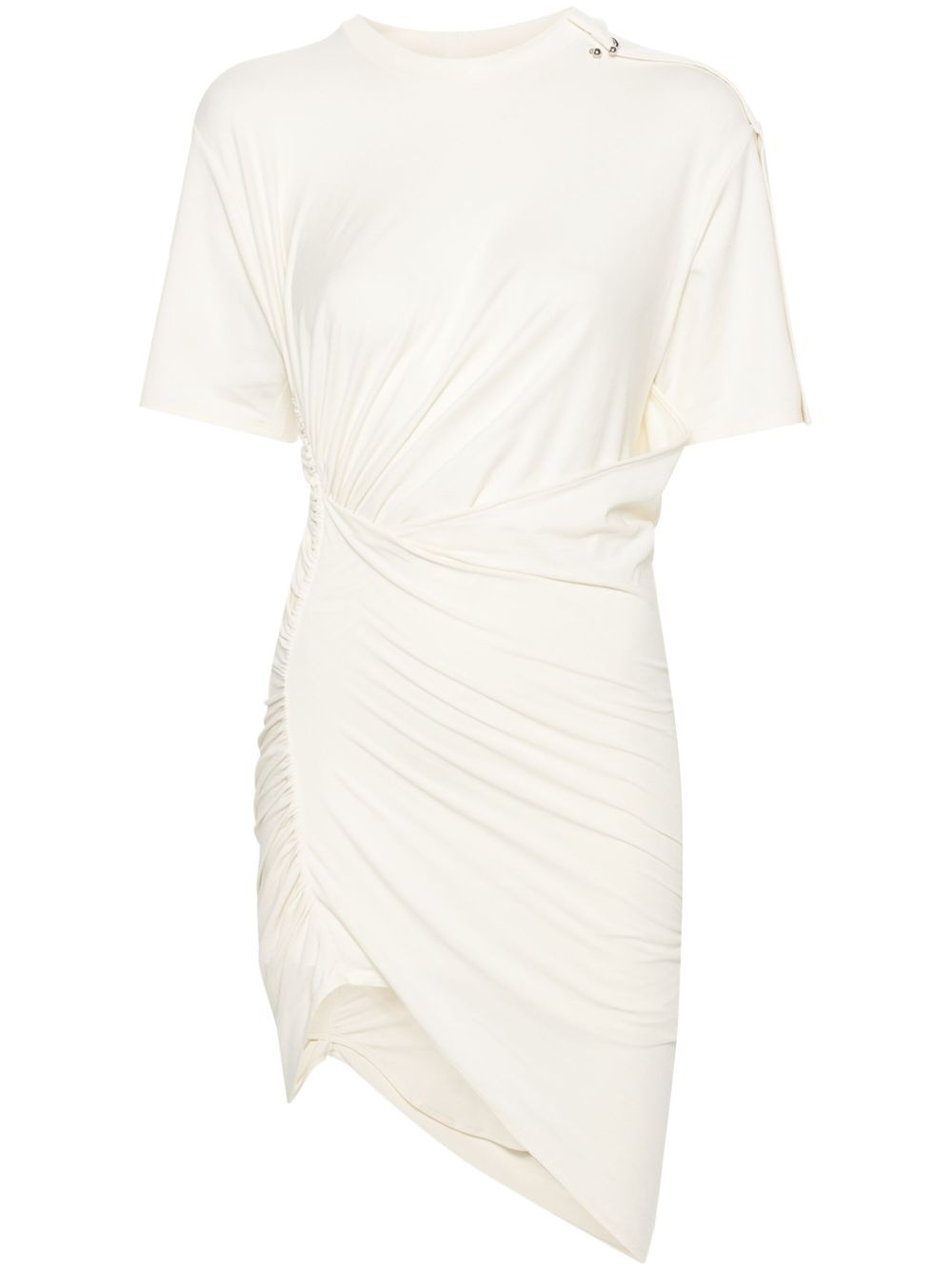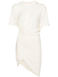 pierced draped T-shirt dress Highlights - Off-white - Cotton blend - Lightweight jersey - Asymmetric design - Silver-tone piercing detail - Draped detailing - Ruched detailing - Crew neck - Short sleeves - Asymmetric hem - Thigh-length Imported Composition Cotton 91%, Spandex/Elastane 9% SIZE & FIT Model measurements Height 5 ft 9 in(1.76 m) Bust/Chest 31.88 in(81 cm) Hips 35.43 in(90 cm) Waist 24.8 in(63 cm) FittingInformation Designed for a loose fit at the chest with a close fit over the waist and hips Made from a midweight stretch fabric, this piece offers elasticity and flexibility when worn This piece fits true to size – take your usual size