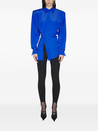 padded-shoulder gathered shirt Highlights - Blue - Padded shoulders - Twisted front - Long sleeves - Button fastening - Asymmetric hem Imported Composition Fabric 100% Washing instructions Read Manufacturer Guidelines