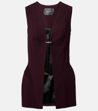 Best known for its sculptural silhouettes, the Parisian house of Mugler challenges conventional fashion design. This vest is designed with an open front secured by a clip and features padded hips for a structured look. Product Details - Material: 78% viscose, 22% wool - Care instructions: dry clean - Made in Ukraine - Designer color name: Dark Plum - Item color: purple - Lining: 100% cupro - Closure: clip fastening - Hardware color: silver - Item number: P01060844 Size & Fit - True to size - Cinched waist - Non-stretchy fabric - Falls below the hip - The model seen in the picture is 178cm-5'10" and wearing a size FR 36