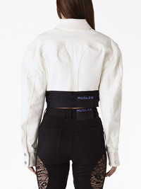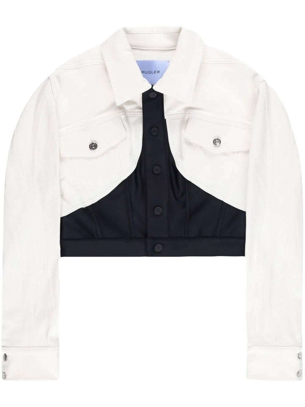 panelled cropped denim jacket An ode to its bold spirit, Mugler reinvents the denim jacket with an unexpected twist. Boasting a cropped construction, it catches the eye with a contrasting boned panel inspired by classic corsetry. Highlights - Ivory white/black - Stretch-cotton - Denim - Panelled design - Classic collar - Front button fastening - Long sleeves - Cropped - Straight hem Made in Italy Composition Cotton 98%, Polyamide 78%, Spandex/Elastane 22%, Elastodiene 2% SIZE & FIT FittingInformation Designed for a slim fit that sits just away from the body offering a close yet comfortable fit Made from a midweight stretch fabric, this piece offers elasticity and flexibility when worn This piece fits true to size – take your usual size
